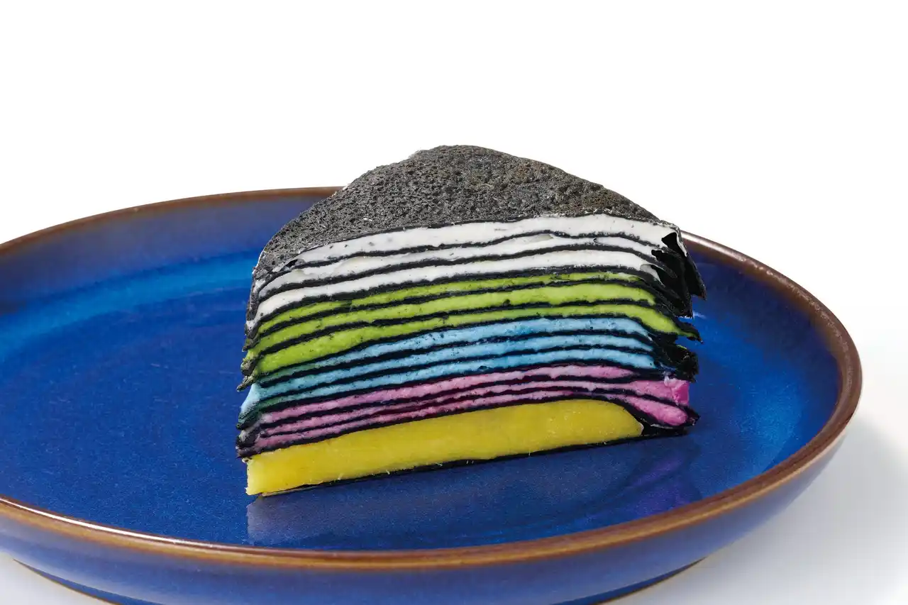 真っ黒な竹炭クレープに、芋ようかん(栗かぐや)と4種のカラフルなクリームを重ねた特別なミルクレープ。(いちご、抹茶、バタフライピー、むらさきいも)天然色素を使用した彩りと、さつまいもの存在感を楽しめる、見た目も味も印象的な「層(SOU)」スイーツです。 |
