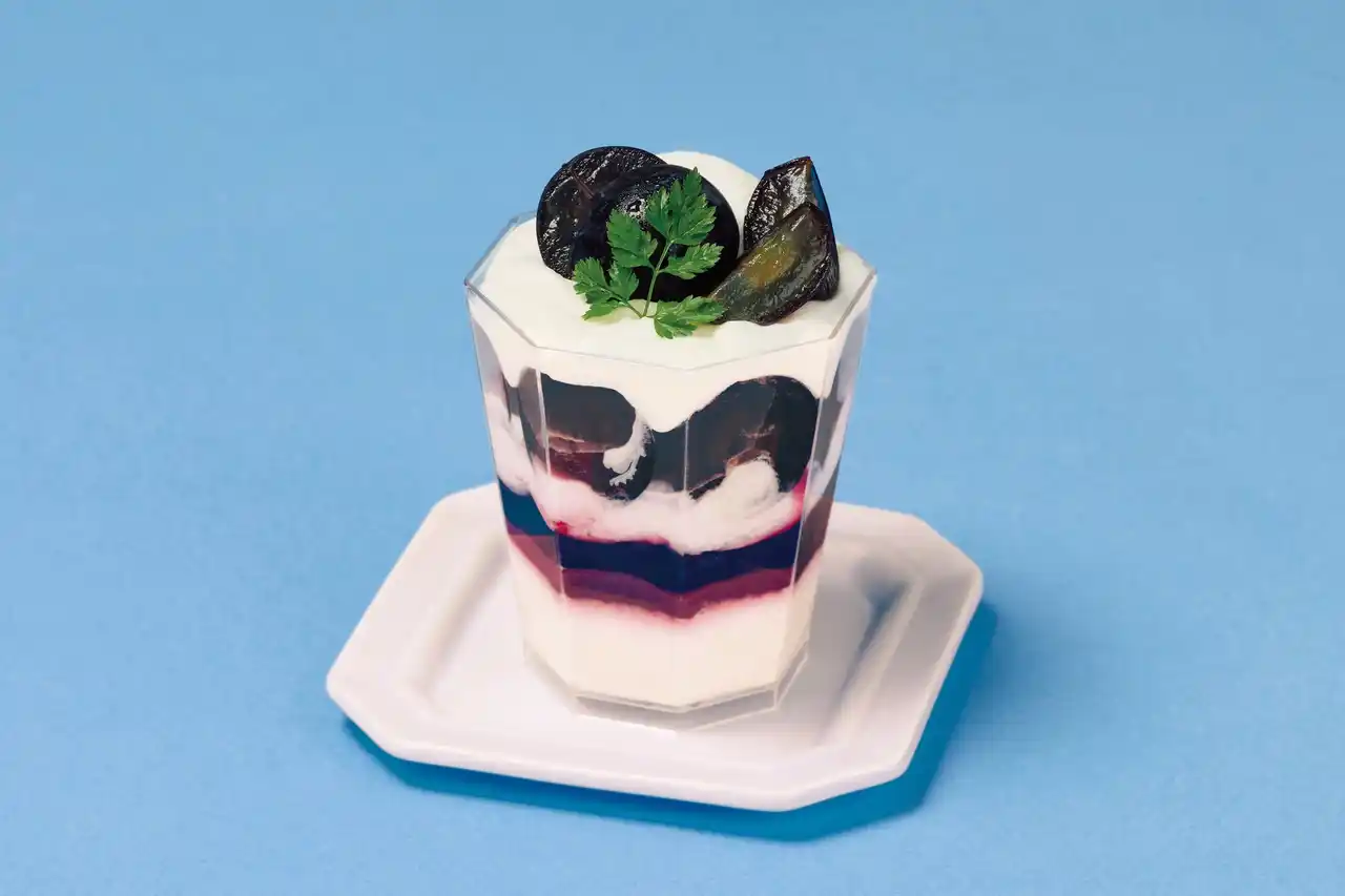 下から順に、ぶどうムース、ぶどう入りゼリー、カシスピューレ入り生クリーム、ぶどうとクランブル、生クリームの5層になったカップデザート。旬のぶどうを贅沢に使用し、いろいろな味と食感の変化が楽しめます。 |
