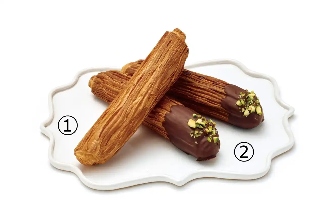 まわりに層をまとったクロワッサン生地の「スティックロワッサン」。サクサクとした食感と発酵バターの香りが特徴です。「バトンショコラ」にはチョコレートをかけてピスタチオをトッピング。 |