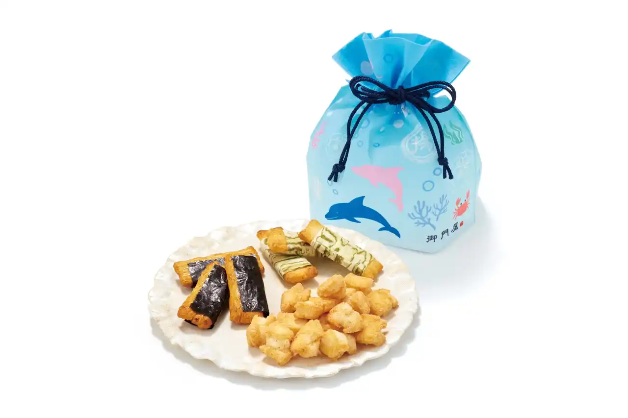 20周年のために作ったあられと、海苔巻きや昆布巻きのおせんべい、定番の揚まんじゅうを一緒に限定巾着に詰めました。 |