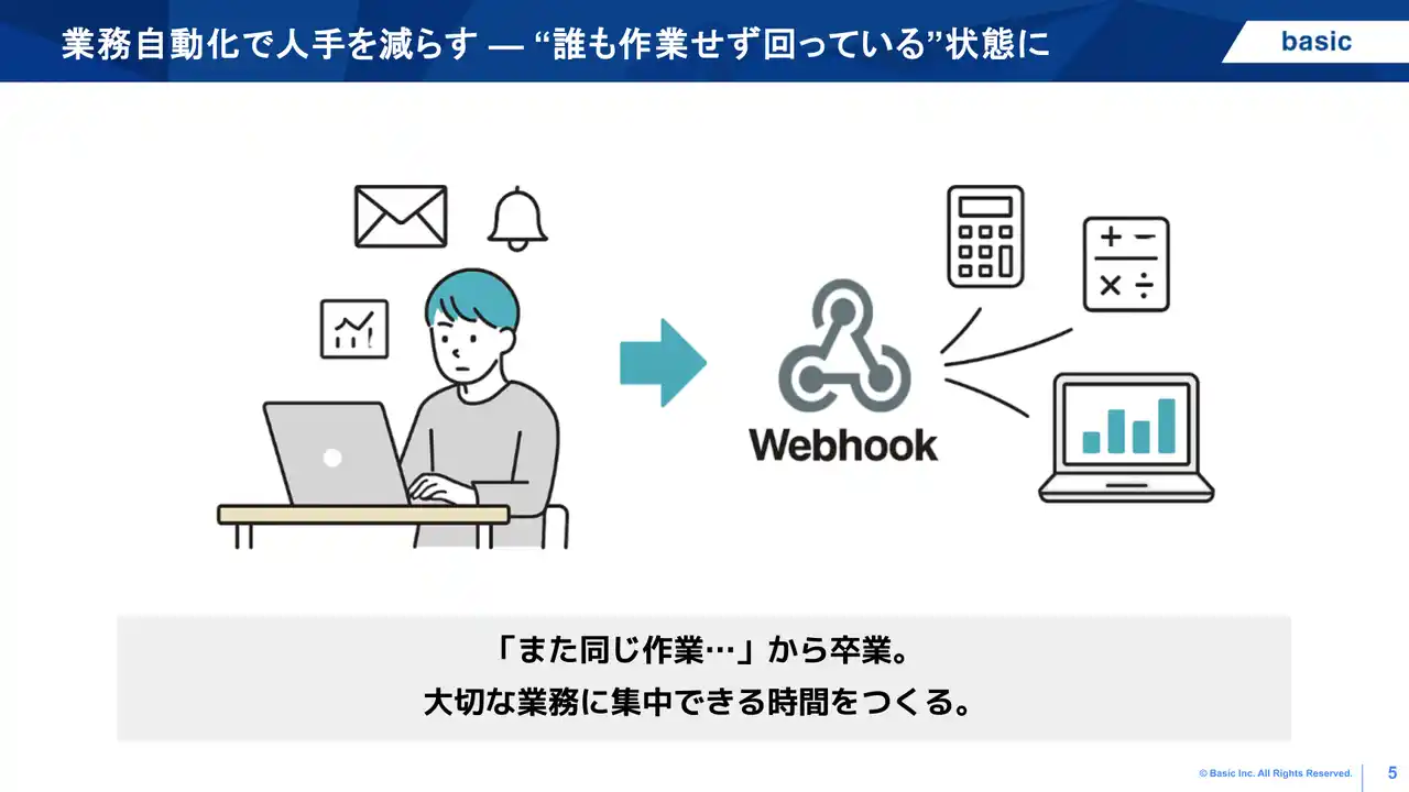 株式会社ベーシック(本社:東京都千代田区、代表取締役:秋山勝、以下「当社」)は、累計50万ユーザーが利用するフォーム作成管理ツール『formrun(フォームラン)』において、2025年8月27日(水)より「Webhook」機能を正式版として提供いたします。 |