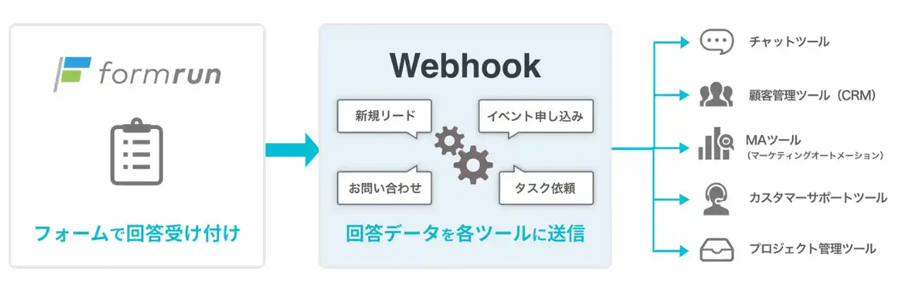 formrunの新機能「Webhook」は、フォーム送信と同時に外部システムへ即時連携。入力から処理までのタイムラグをゼロにし、現場の対応力と業務効率を飛躍的に引き上げます。こうしたニーズの高まりを受け、Webhook機能はこれまでPROFESSIONALプランご利用中のユーザー様を対象にβ版として提供し、多様なユースケースでの活用とフィードバックを重ねてきました。その結果、安定性・拡張性・セキュリティの観点で改善を施し、このたび正式版としてご利用いただけるようになりました。 |