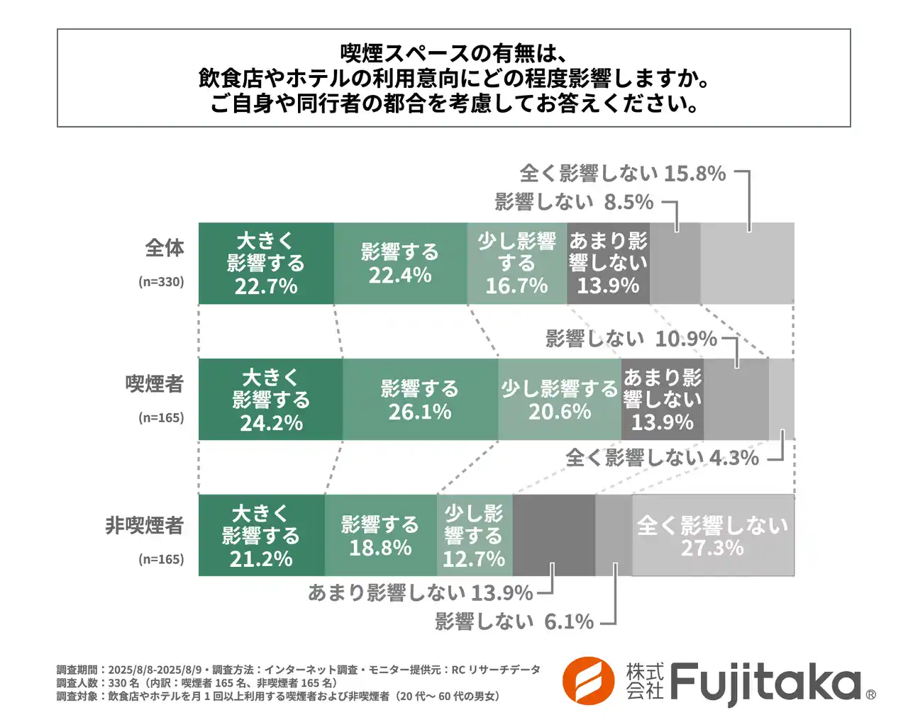 株式会社Fujitaka(本社:京都府京都市 、代表取締役:高井 茂行)は、飲食店やホテルを月1回以上利用する方を対象に「喫煙スペースの有無が飲食店やホテルの集客に与える影響」に関する調査を実施しました。この調査結果から、飲食店やホテル内の喫煙スペースの有無が喫煙者・非喫煙者、それぞれの集客に与える影響などが明らかになりました。