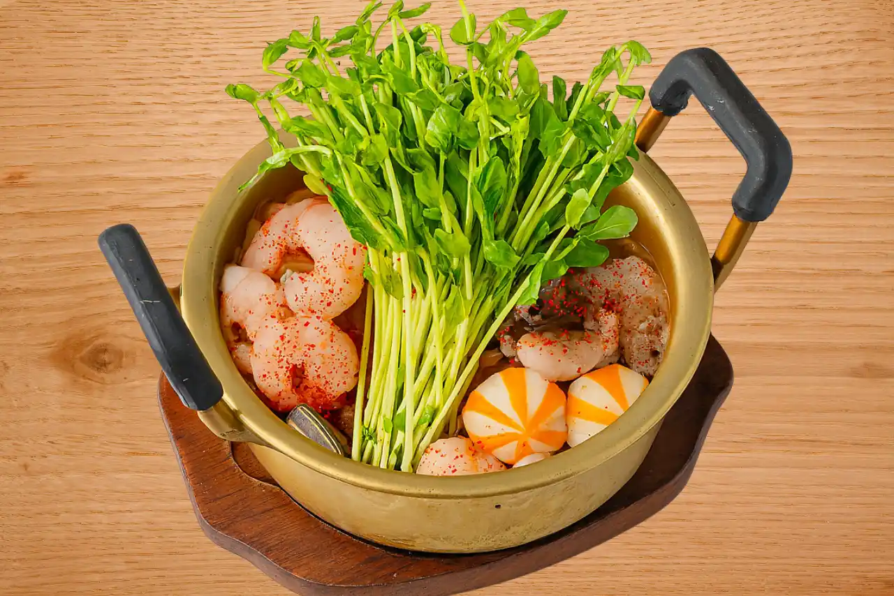 具材:イイダコ1杯、エビ3尾、アサリ3個、ホタテ3個、イカ団子2個、魚卵団子2個、豆苗15g |
