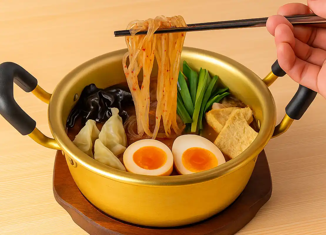30種類以上の具材からお好みの具材を選びます(例:豚肉、牛肉、鶏肉、スパム、エゴマ、トッポギ、韓国おでん、マンドゥー、韓国海苔、イイダコ、エビ、魚卵団子、チーズなど) |