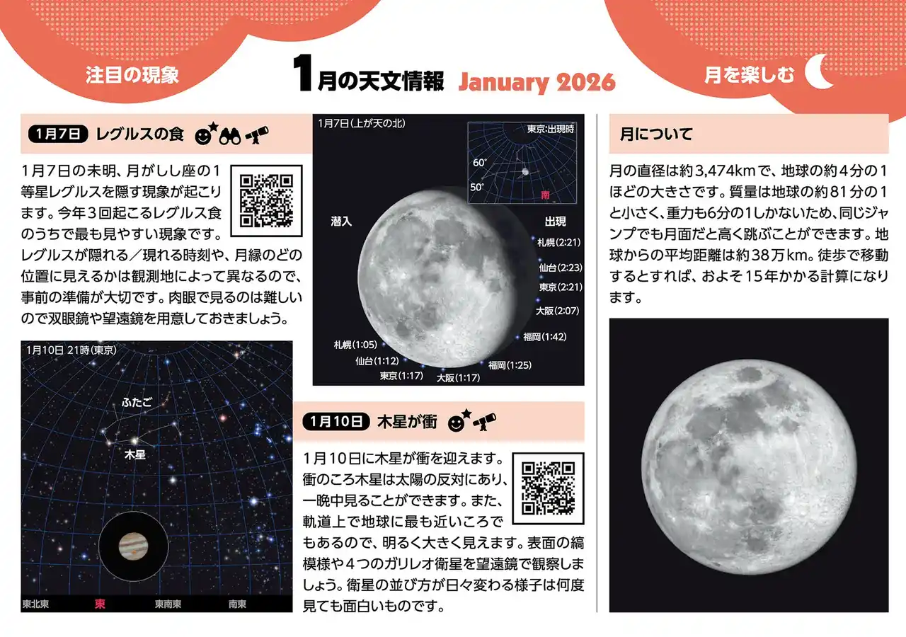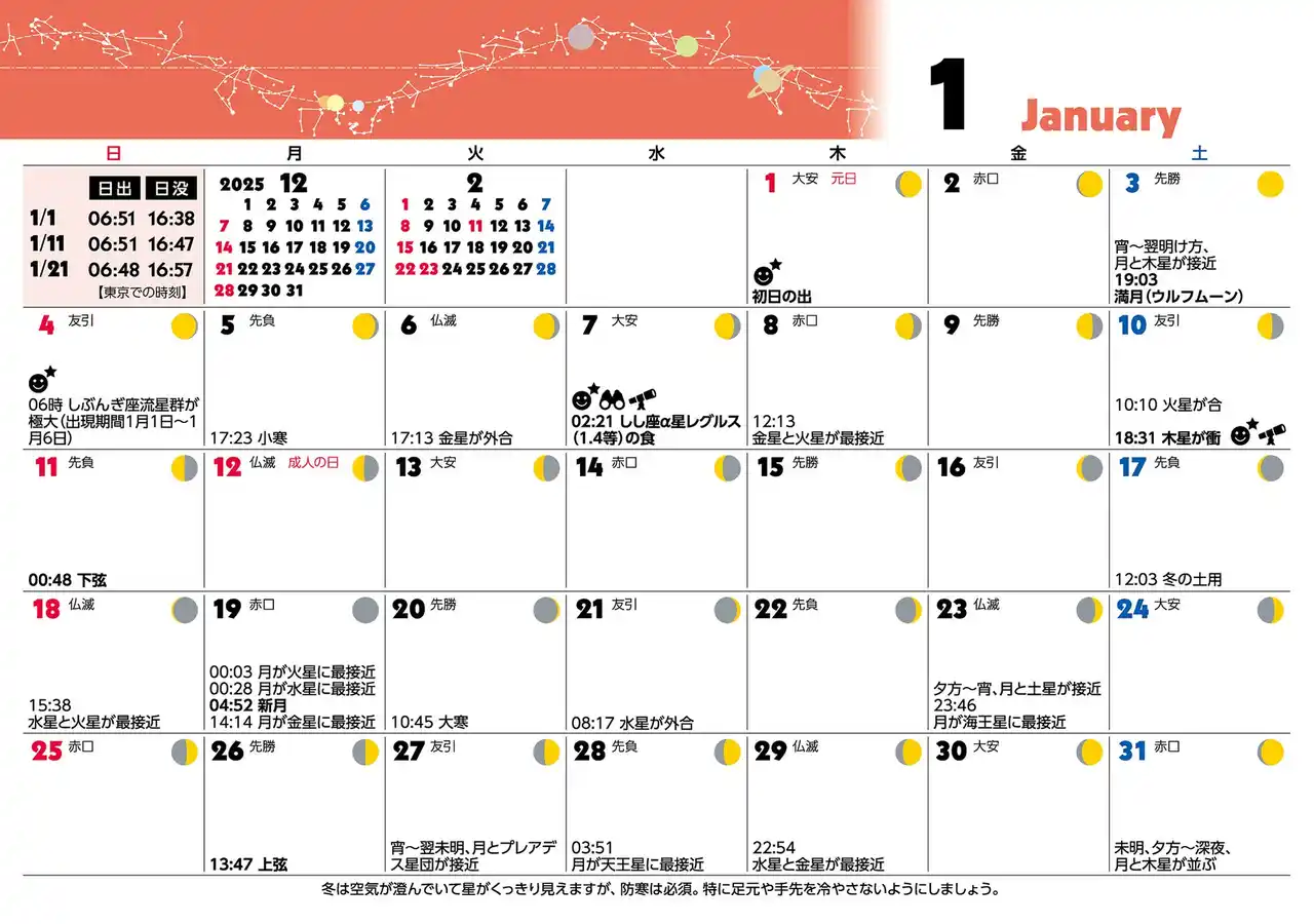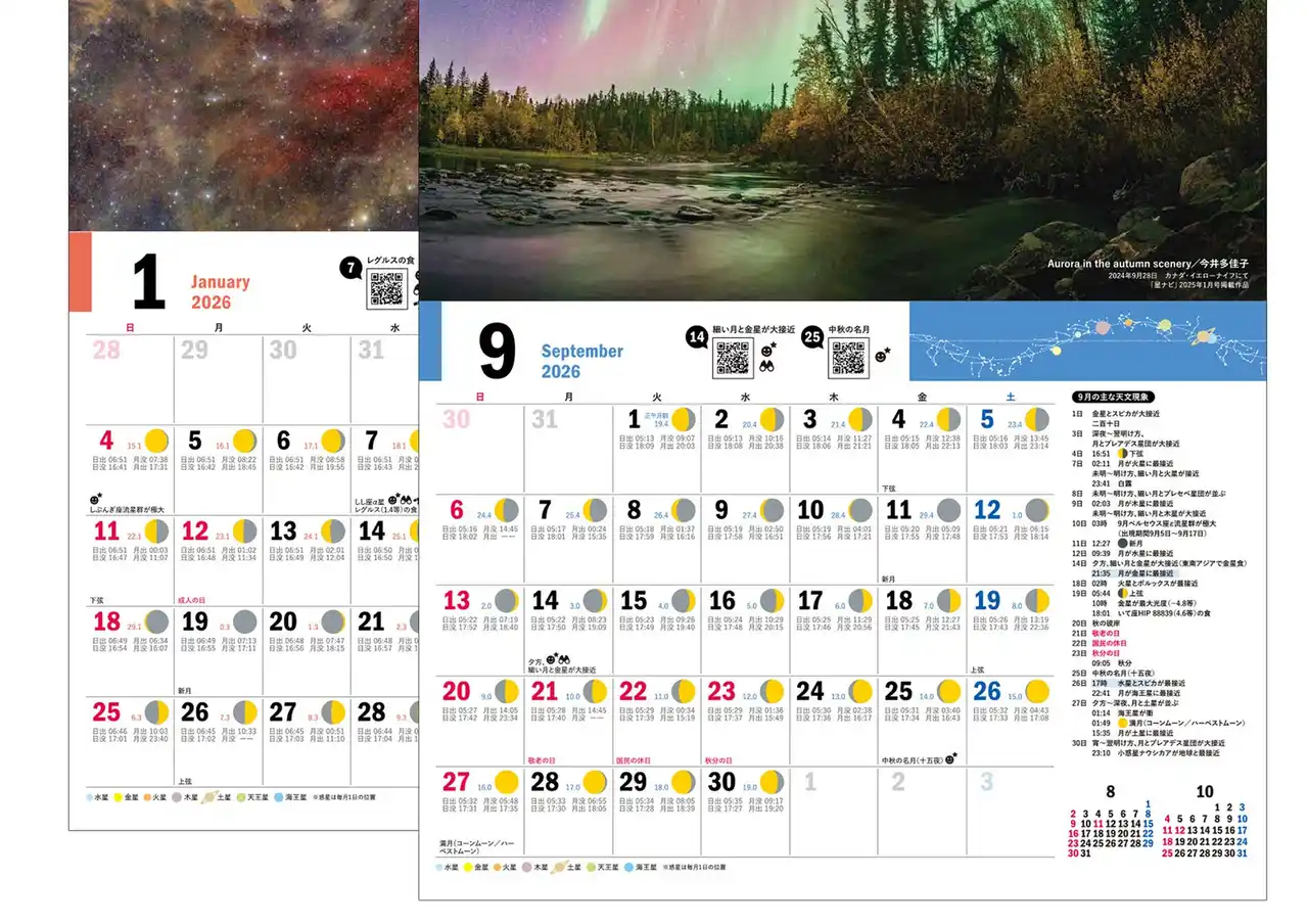 | 天文ソフト「ステラナビゲータ」の開発や天文雑誌「月刊星ナビ」の発行など天文関係プロダクツの開発会社である、株式会社アストロアーツ(東京都・渋谷区 代表取締役社長:大熊正美)は、2026年の星空の見どころがわかるカレンダー「星空こよみ ASTROGUIDE CALENDAR 2026」を2025年8月27日に発売しました。 | |||||||||||||||||||||||||||||||||