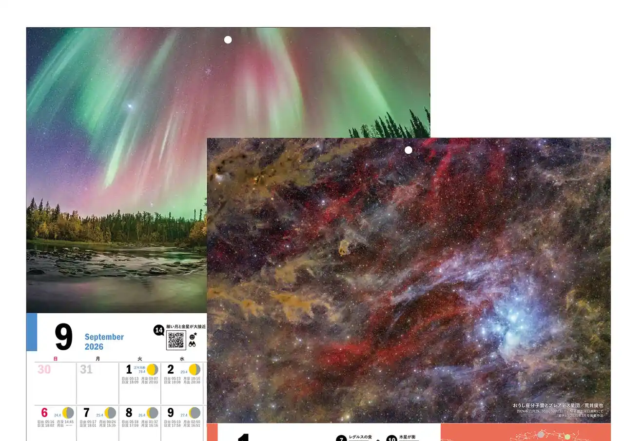 | 「星空こよみ ASTROGUIDE CALENDAR 2026」は2026年の天文現象や星空情報をまとめたカレンダー。「卓上版」と「壁掛け版」の2種類同時発売です。 | |||||||||||||||||||||||||||||||||