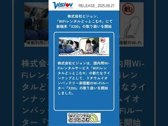 株式会社ビジョン(本社:東京都新宿区、代表取締役社長 COO:大田健司、以下当社)は、国内用Wi-Fiレンタルサービス「WiFiレンタルどっとこむ(R)」の新たなラインナップとして、リチウムイオンバッテリー非搭載のWi-Fiルーター『X200』の取り扱いを開始しました。 |