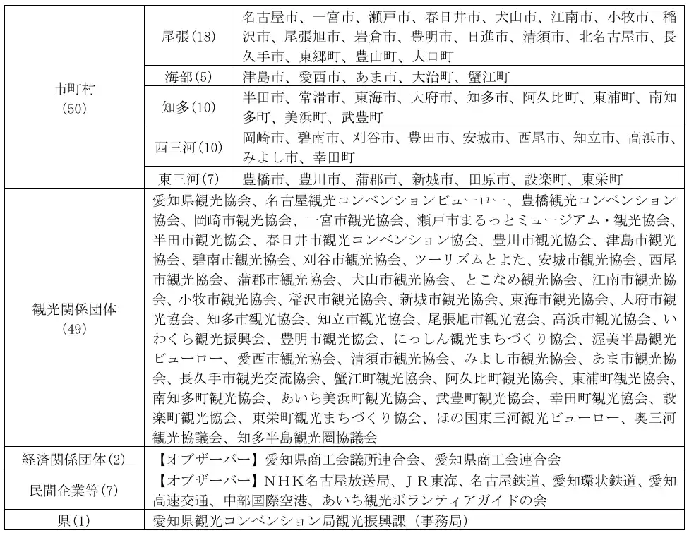 2023年の大河ドラマ「どうする家康」の放送を契機に、本県の「武将観光」を全国に広くPRするため、県、市町村、観光関係団体、経済関係団体等で構成する「愛知県大河ドラマ『どうする家康』観光推進協議会」を設立し、2か年に渡り、観光誘客の拡大と周遊観光の促進の取組を実施してきた。このオール愛知での連携体制をレガシーとして継承するとともに、他方で取組を進めてきた「お城観光」、「街道観光」のテーマも掛け合わせて、一層の「歴史観光」の振興を図るため、2024年2月、「あいちの歴史観光推進協議会」を設立した(2024年2月13日発表済み)。 |