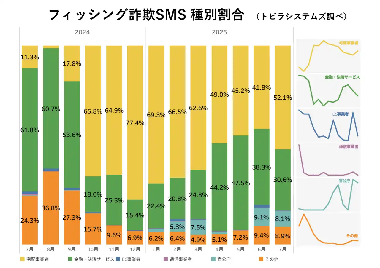 | トビラシステムズの調査で、2025年7月に確認されたフィッシング詐欺のSMSの種別割合は、前月まで減少傾向だった宅配事業者をかたる手口が再び増加し、52.1%となりました。 | |||||||