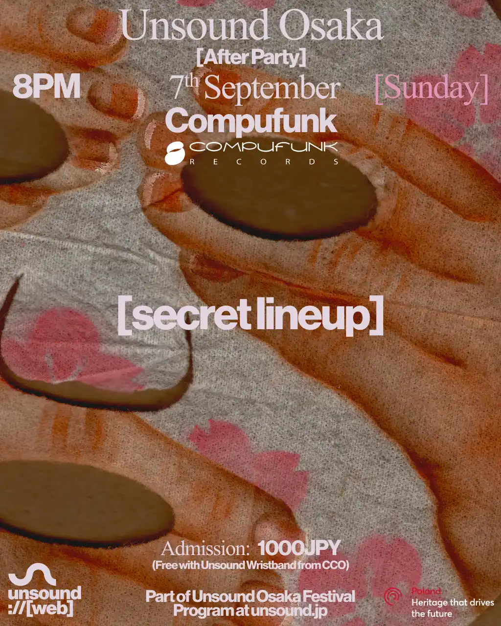 | 9月7日(日)にメインプログラムが開催される大槻能楽堂から徒歩圏内のレコードストア兼クラブCompunkにて、Unsound Osakaのフィナーレを飾ります。出演者はシークレット。また、クリエイティブセンター大阪、大槻能楽堂で開催されるメインプログラムへの参加者は、リストバンドを提示いただくことで無料でこちらのアフターパーティーをお楽しみいただけます。 | |||||||||||||||||||||||||||||||||