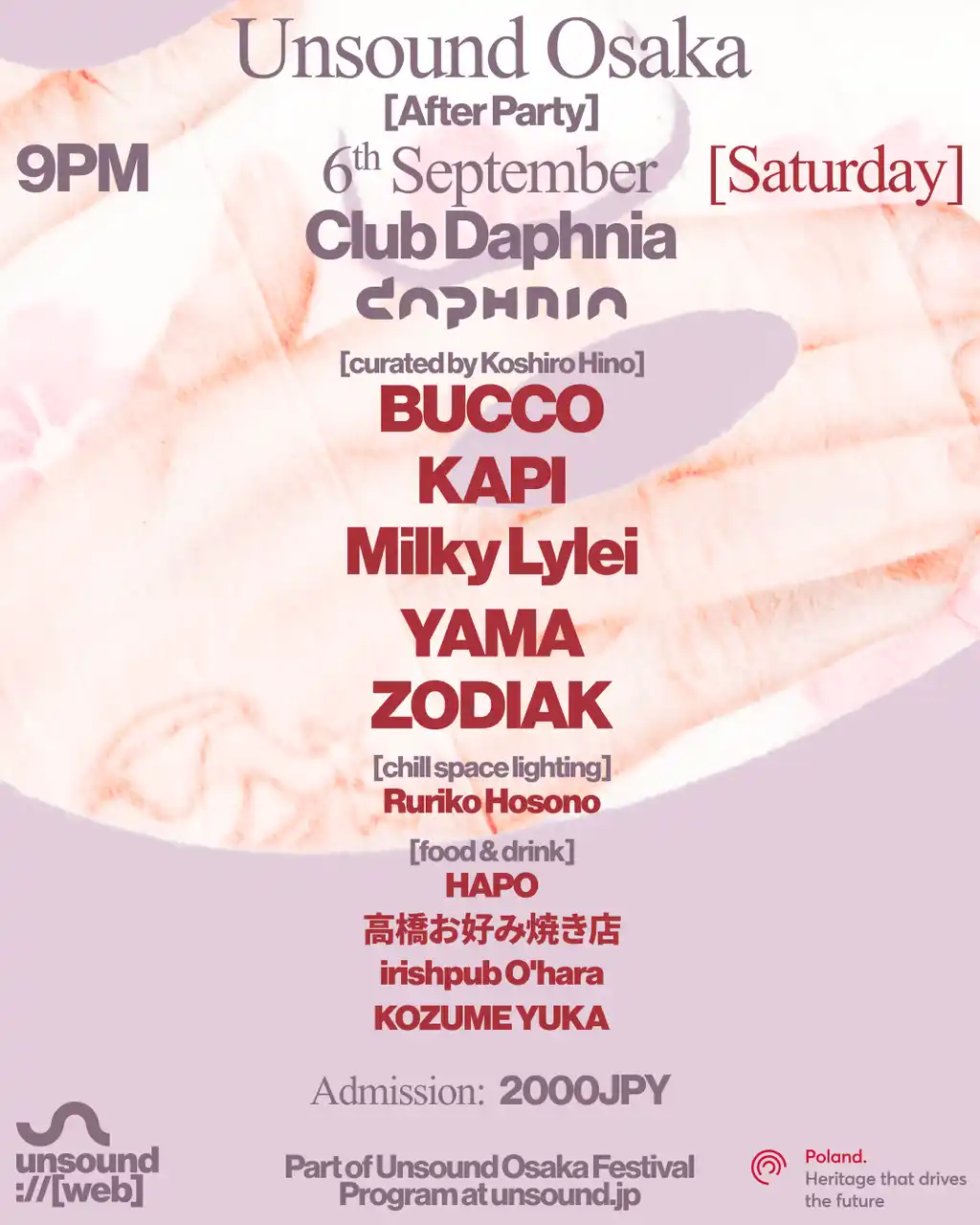 クリエイティブセンター大阪でのメインプログラム終了後には、徒歩県内のクラブClub Daphniaにてアフターパーティーを開催します。goatやYPYでの活動を通じ国際的に高い評価を得る日野浩志郎がキュレーションを担当。関西圏で活躍する DJのYAMA、ZODIAK、BUCCO に加え、九州出身で大阪を拠点とするライブデュオ Milky Lylei、さらに仙台からのゲストDJ KAPI が出演します。 Unsoundのスピリットを体現し、実験的なサウンドからレフトフィールドなダンスミュージックが展開される一夜となります。 |