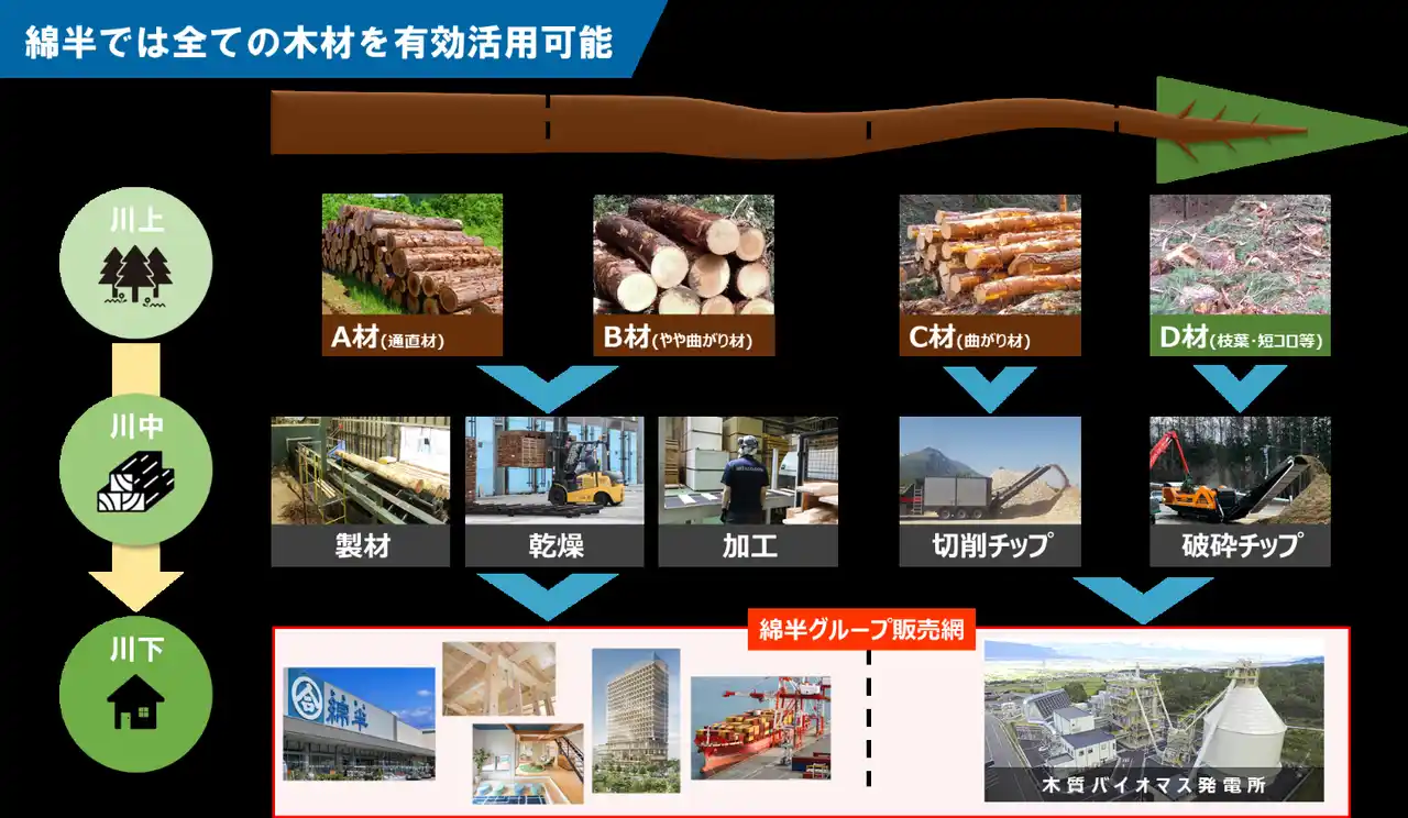 | 取得した飯田市千代の山林を含め、飯田市周辺から伐採された木材は、2024年6月27日に取得した龍江インター産業団地に運び出し、発電所用のチップ、住宅用の構造材や内装材になるほか、それらの加工品を綿半ホームエイドでの販売や、非住宅木造建築への利用・海外への輸出など、綿半グループのリソースを最大限に使用し、余すことなく活用していきます。 | |||