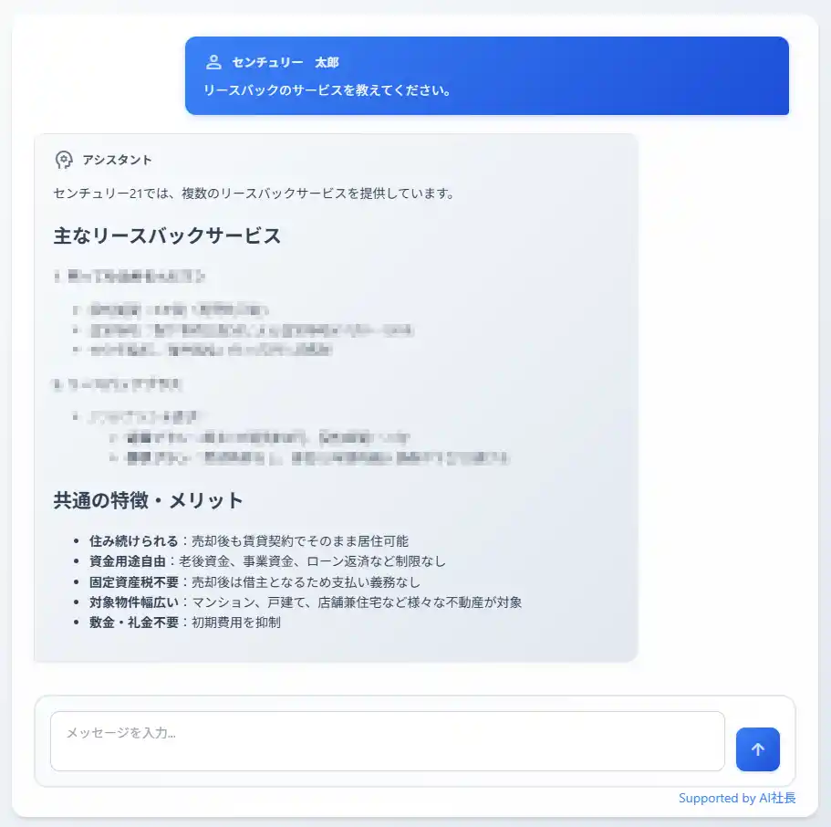 株式会社センチュリー21・ジャパン(本社:東京都港区、代表取締役社長:高坂勇介、以下「当社」)は、株式会社THA(本社:東京都新宿区、代表取締役:西山朝子、以下「THA」)が開発した専用AIツール「AI社長」を導入したことをお知らせいたします。 |