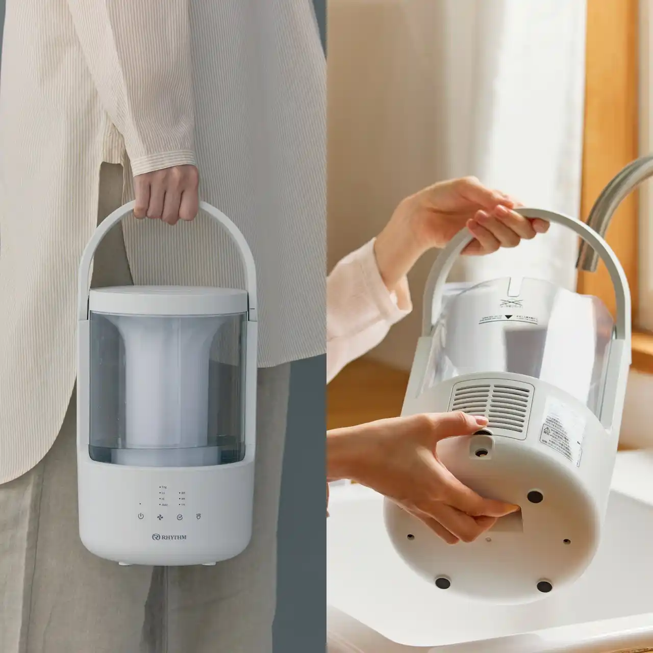加湿器を使用する一連の動作を観察し採用し、使いやすさと持ち運びに便利な可動式大型ハンドルと底面の凹状手掛かりを採用。電源プラグを抜く、加湿器を持ち運ぶ、残水を捨てる、加湿器を洗う、再びタンクに水を入れるという一連の動作をスマートに行うことが可能です。 |
