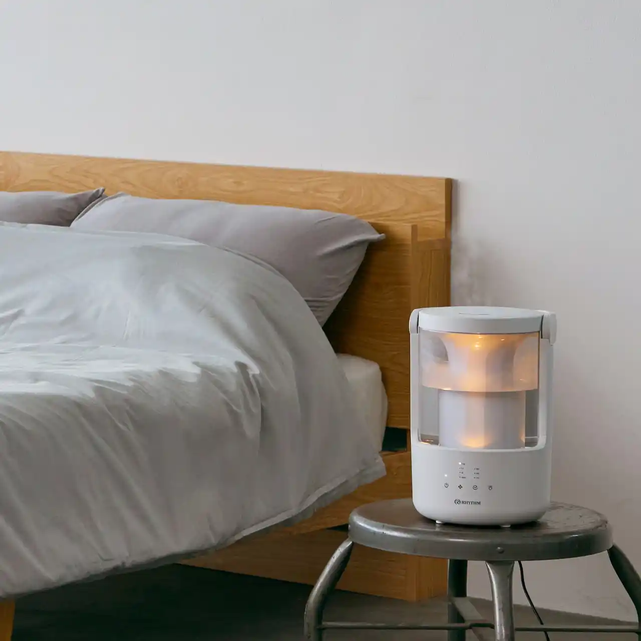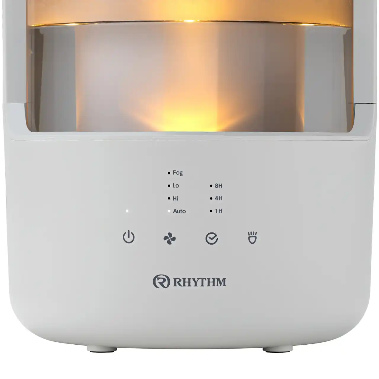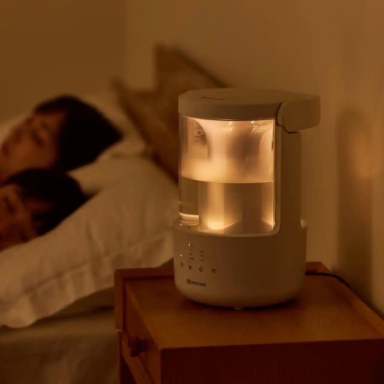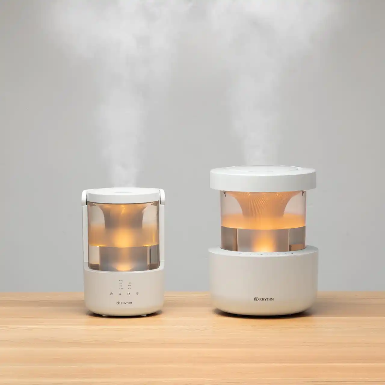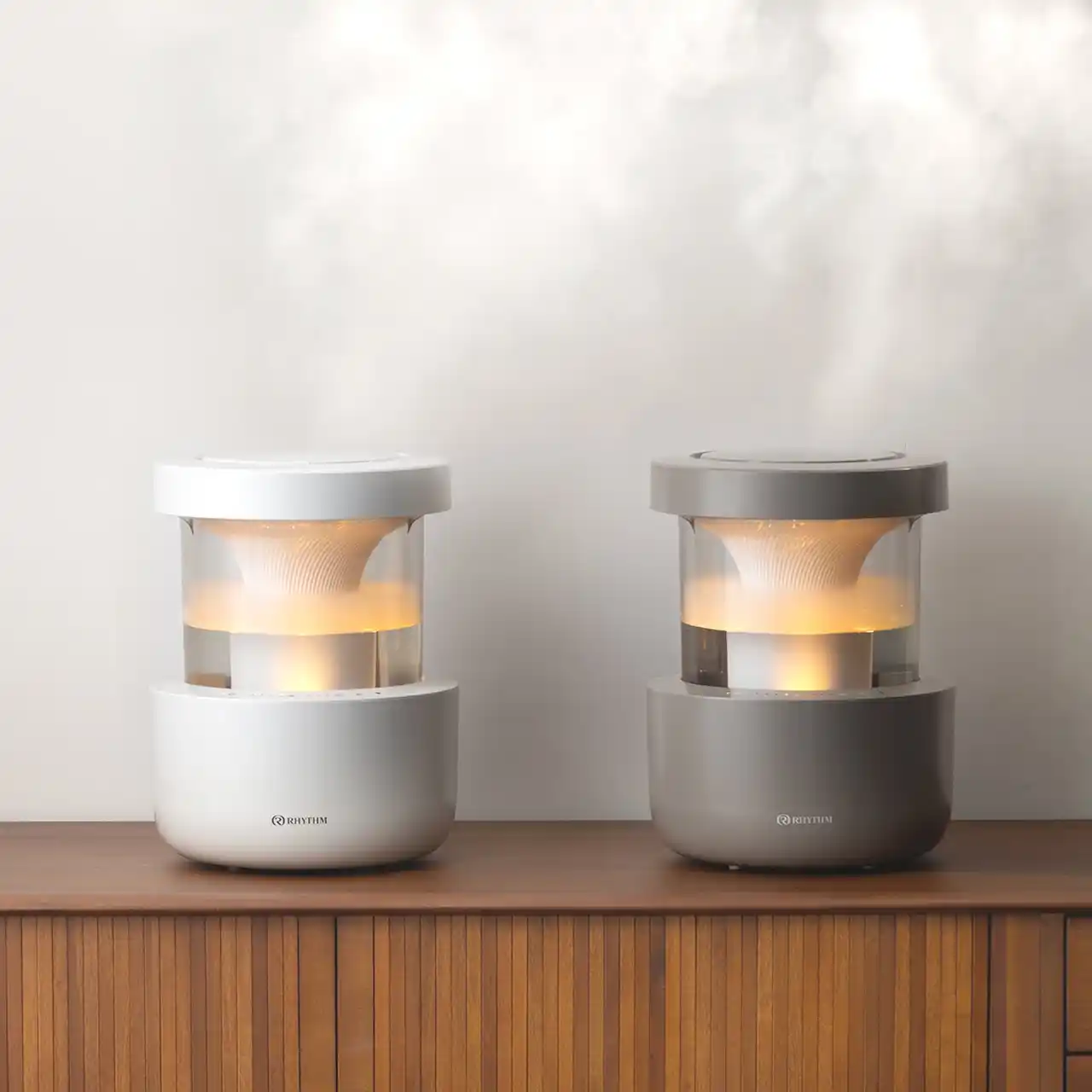 電源を入れると暖色のあたたかなあかりと共に加湿が始まる際、雲海のような霧がタンク内にたまり、霧が高く放出し加湿するリズム独自(特許取得済)のくつろぎの時間を演出します。 |