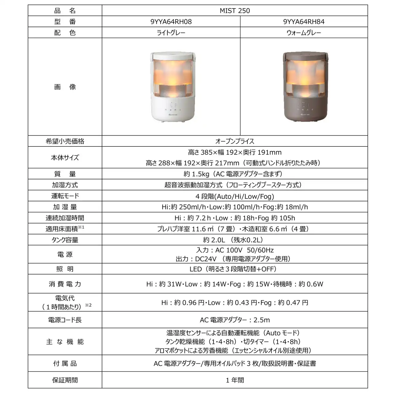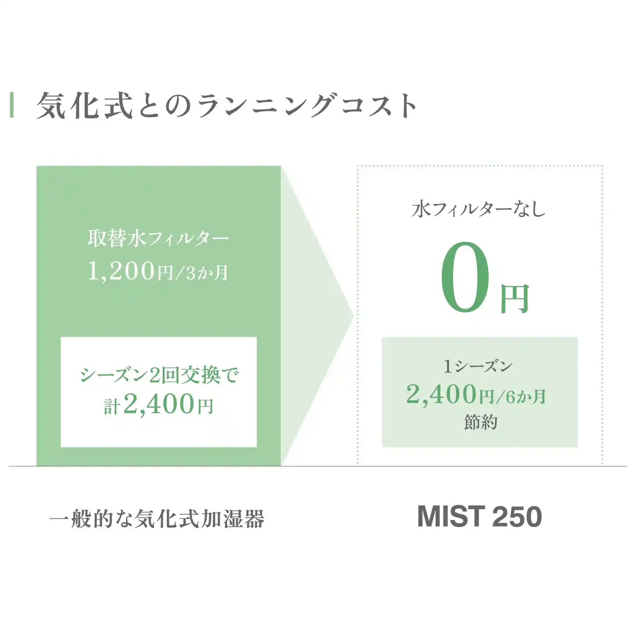 MIST 250は電気代や交換部品の低減が可能なため、環境と財布に優しい加湿器です。 |