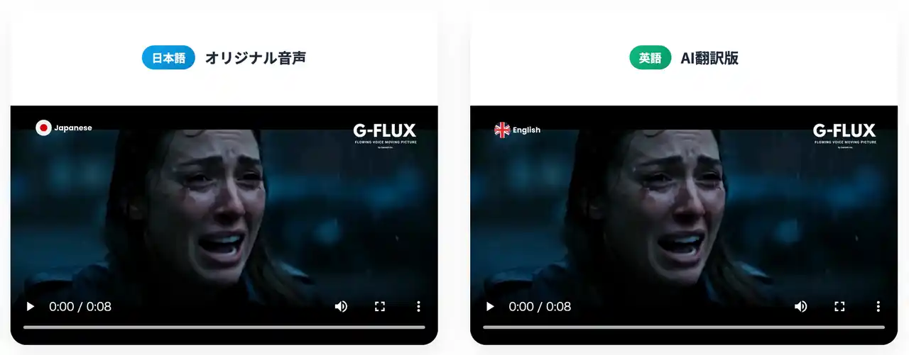 《G-FLUX》は世界最高水準・翻訳精度95%超の独自AI翻訳エンジンを搭載。2025年8月の高品質な音声コーパスを使用したバージョンアップにて、さらに滑らかで自然な発音の吹替表現も可能となり、従来以上に「人間らしい感情とイントネーション」を実現しました。 |