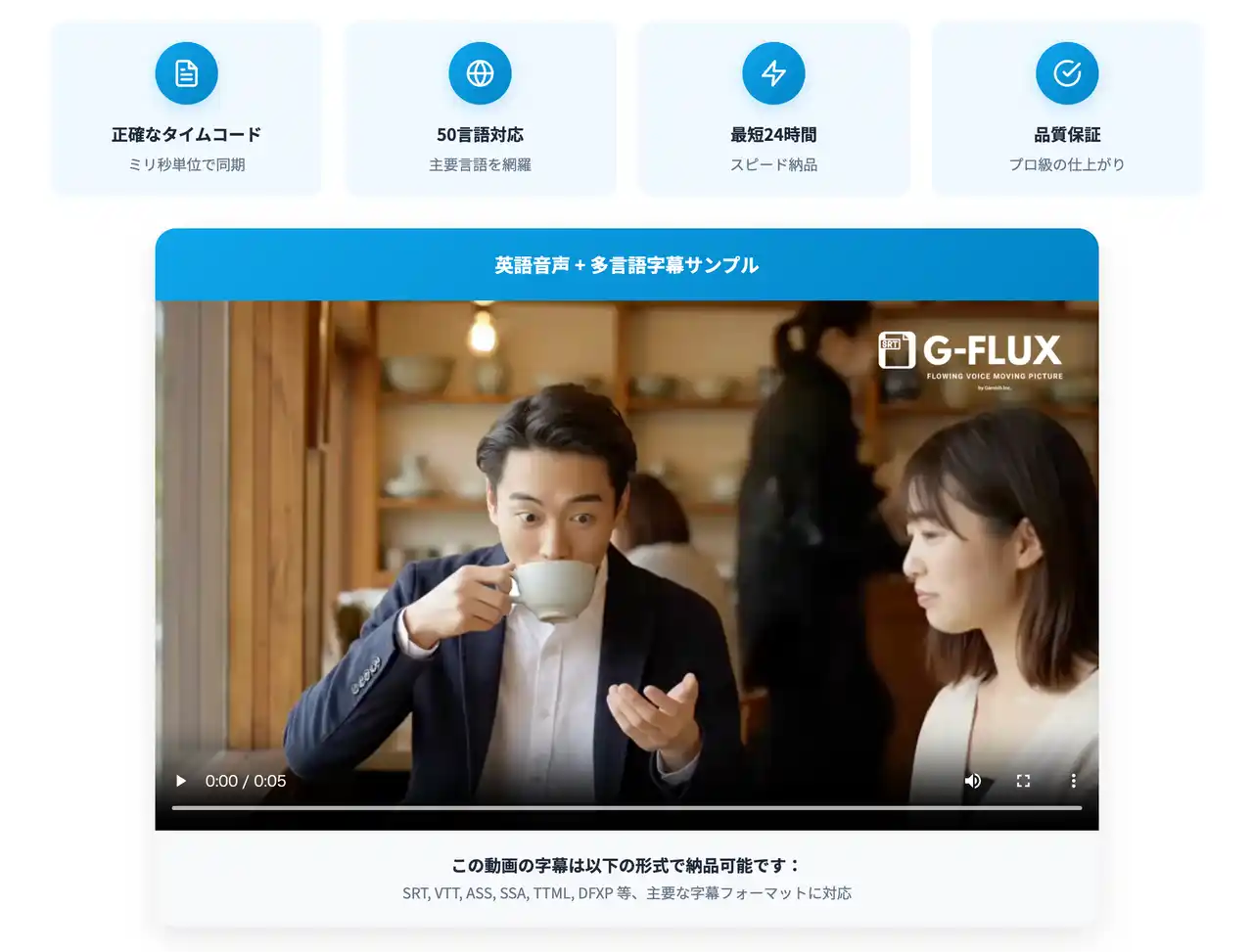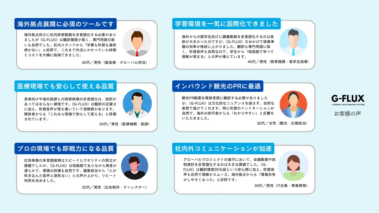 《G-FLUX》はすでに、国内外の大手企業、ビジネスメディアの編集現場や広告制作会社でも採用されており、翻訳の正確さや自然な吹替表現、字幕の一貫性が高く評価され、信頼できる制作基盤として認知されています。 |