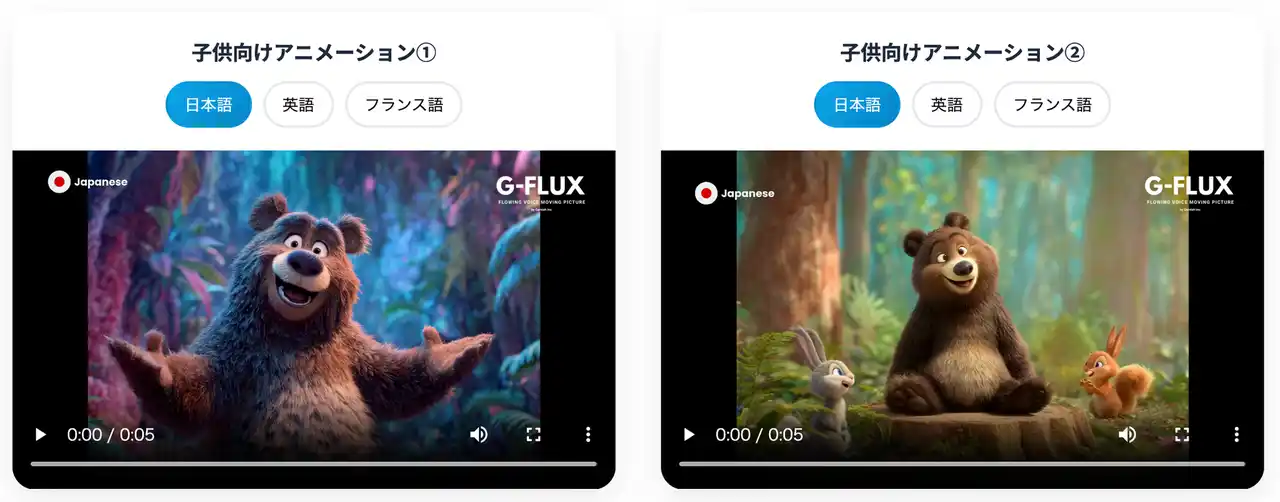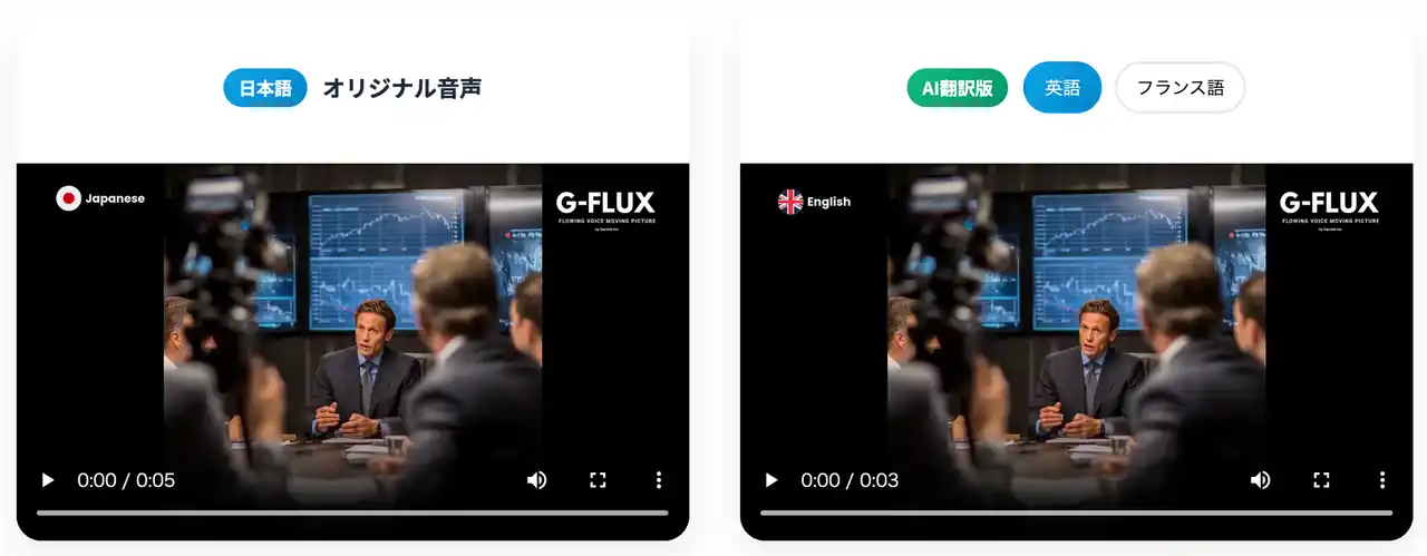 《G-FLUX》は、映像を多言語化するためのオールインワンAIソリューションです。日本語で制作された動画を、英語・中国語・韓国語などへ自動翻訳し、翻訳原稿・吹替音声・字幕を一括で生成。「翻訳精度95%超の独自AIエンジン」によって、映像制作者が求める「正確さ」と「自然さ」を同時に実現します。 |