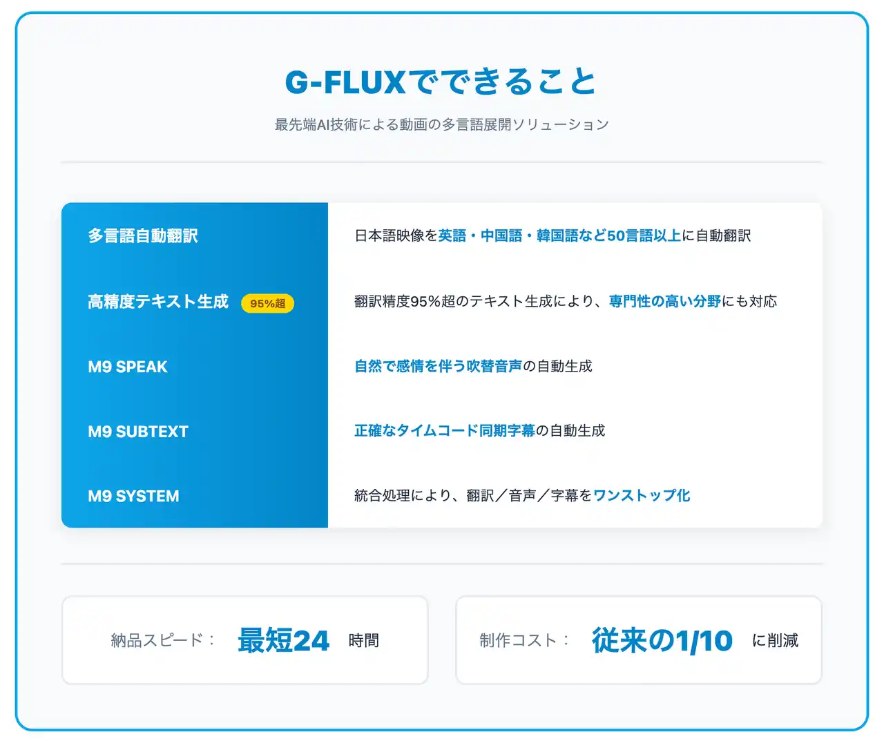 動画の多言語化は、可能性を世界に広げます。私たちの《G-FLUX》は翻訳ツールではなく、映像の力を世界へ届ける“制作基盤”です。M9の持つ高精度翻訳・感情音声合成・字幕技術を統合し、訳文・声・字幕の呼吸を揃えた安心できる品質基準を提示し、新たなグローバルスタンダードを広く提供いたします。 |