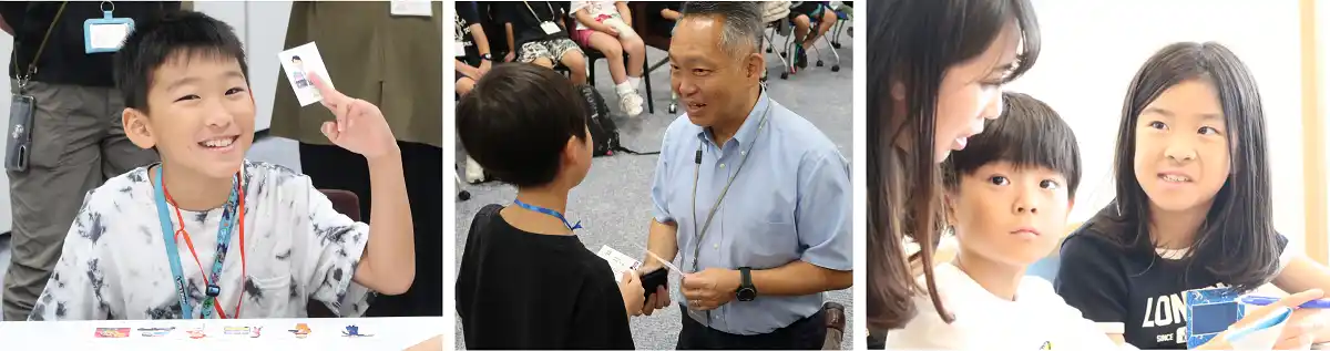 ・社長と交換したカードには「自分の将来の夢」を記載する欄がありました。こどもたちは答えを悩んだり、習い事や好きなスポーツをヒントにしたり、具体的な職業をすでに思い描いていたりとさまざまでしたが、一生懸命に考える姿が、とても印象的でした。その後、緊張しながら社長とカードを交換している様子は、見ていてとても微笑ましかったです。 |