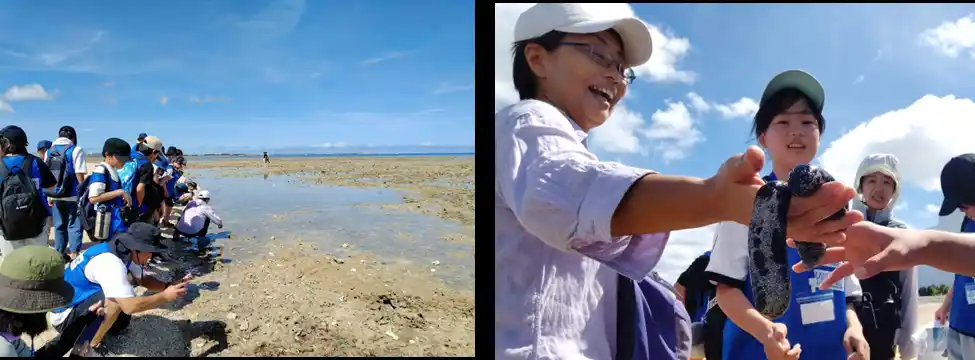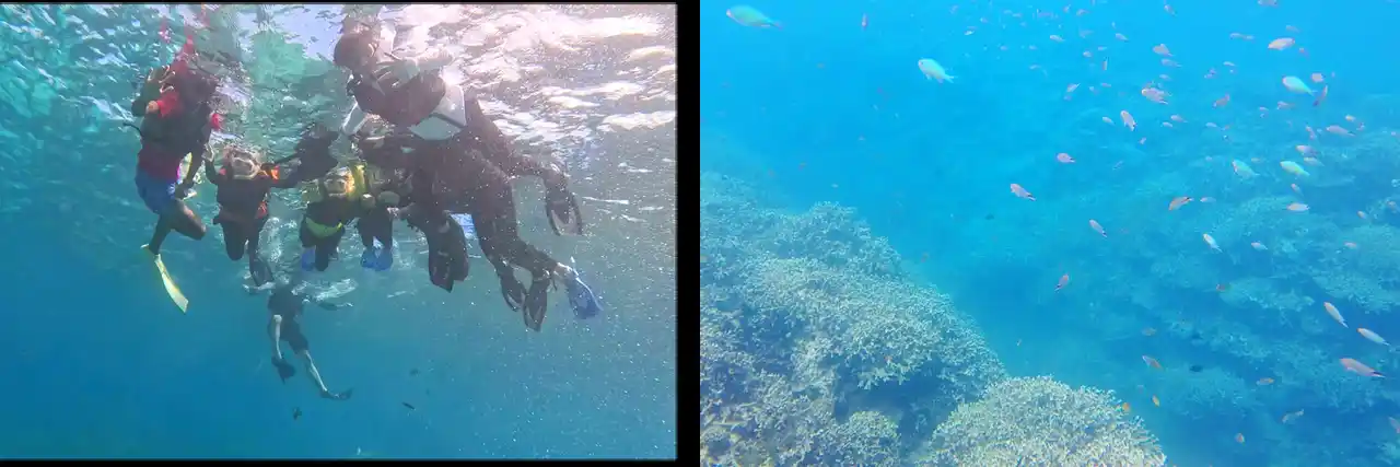 2日目は、サンゴ礁の学習としてシュノーケリングで海の中を観察しました。青く透き通った海にはサンゴをはじめ、たくさんの魚やヒトデなどが生息し、驚きと感動の体験となりました。インストラクターの先生からは、近年、サンゴの白化現象で多くのサンゴが死んでしまっていることや海水温の上昇で魚が棲めなくなっていることなどを聞き、海の美しさとともに、課題を抱える海の現状も知りました。 |
