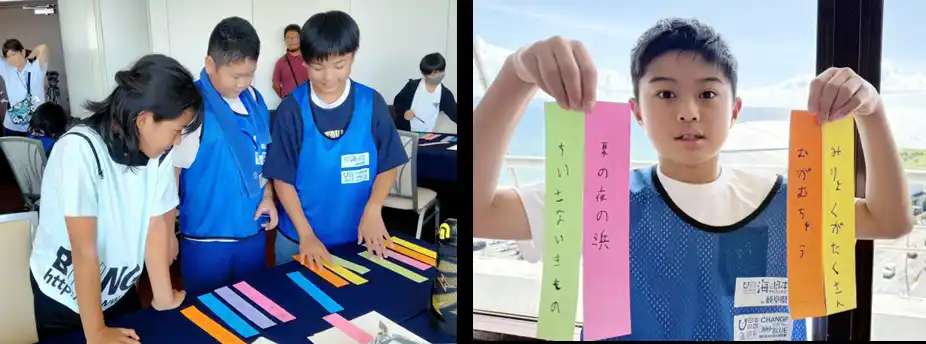 川や海で様々な体験学習を行った子ども達は、感じたことや学んだことを「琉歌」で表現しました。琉歌は、「8・8・8・6」の30音で詠む、沖縄独特の詩歌です。子ども達は、文字数を数えながら、沖縄で学んだことや心に残ったことを短冊に記しました。また、一人一人が作った琉歌をグループで見せ合い、みんなの短冊を組み合わせて、グループごとに新たな琉歌を作りました。 |