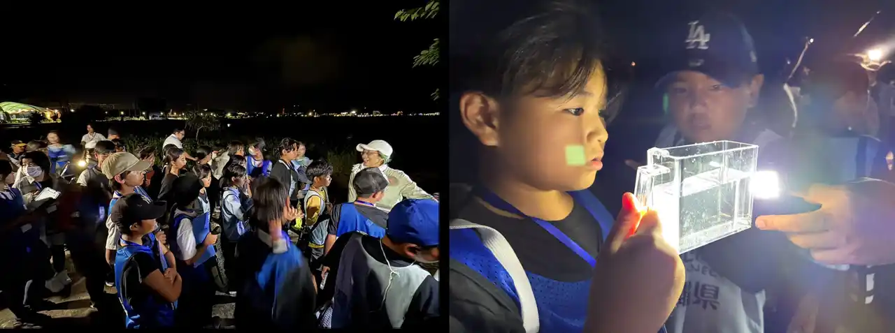 夜は、海辺を散策しながら海のプランクトンを採集しました。プランクトンとは何か、どのように採取するのかなどを、海の環境教育に取り組む「しかたに自然案内」の鹿谷麻夕先生に教えてもらいました。川でうまれたアユの赤ちゃんは、川の流れにのって海まで行き、海のプランクトンを食べながら大きくなり、再び川に戻ってきます。海のプランクトンがアユにとって大切なものと聞き、子ども達は興味津々。波の音や潮の香りも五感を刺激するワクワク、ドキドキの夜の海辺散策となりました。 |