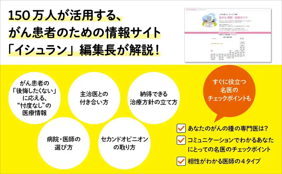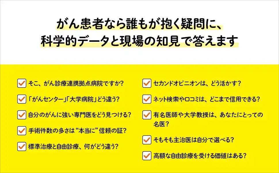 | 著者は医療コンサルタントとして、多くのがん患者や家族と向き合ってきた経験を持ち、医師や病院に関する専門的な知見と、現場のリアルな声を豊富に収集。本書は、特定の医師を推薦するのではなく、「あなた自身が選べるようになる」ための思考のガイドです。 | |||