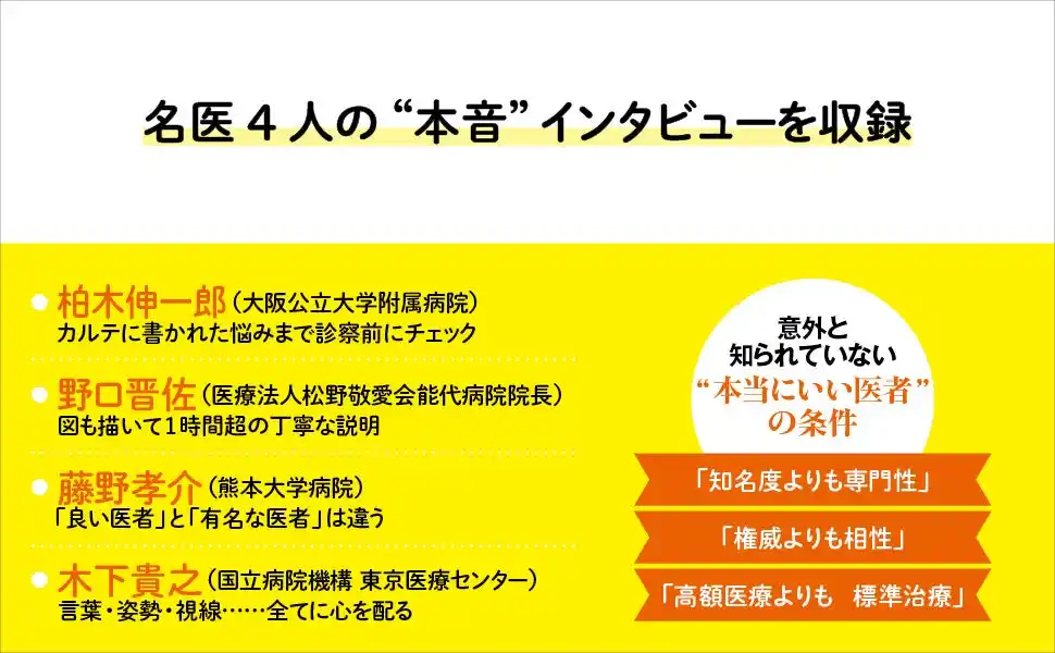 | さらに、全国の患者から信頼を集める4人の「がんの名医」へのインタビューも収録。医師たちが語る「信頼される医者の条件」は、単なる技術や実績だけではなく、患者とのコミュニケーション、相性、説明の姿勢、治療への向き合い方といった“人間性”にも及びます。 | |||