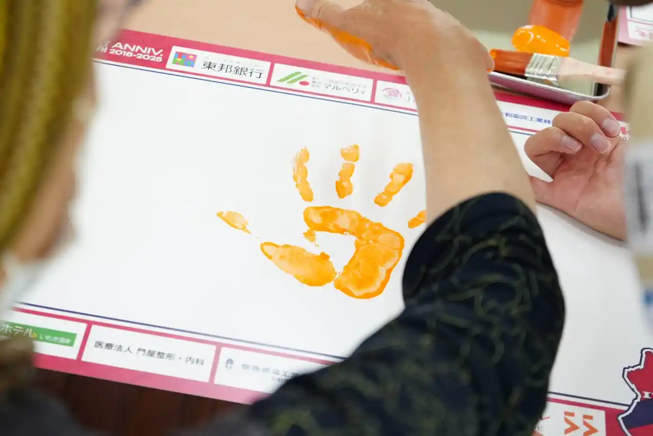 | 今年6月と7月「広野町花ぶさ苑」と「デイサービス人生の里」訪問した際に、入所者の皆さまからいただいたエールや手形をデザインした横断幕を展示。ぜひご覧ください。 | |||