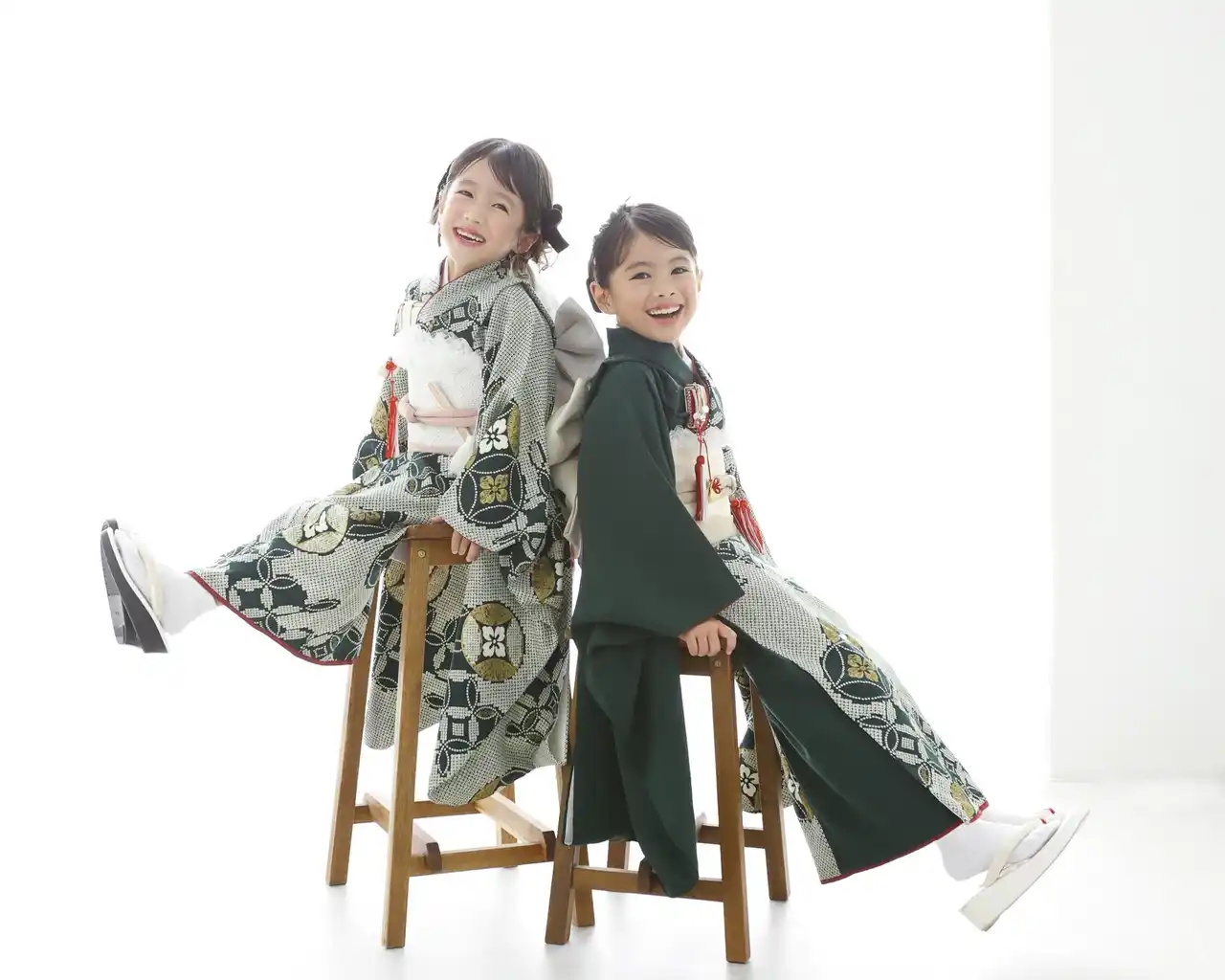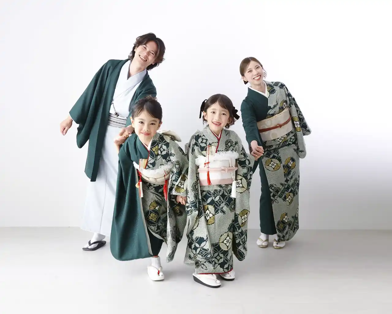 七五三祝い写真でも、期間限定のお得なキャンペーンを実施中です。 2025年の新作着物も、「愛犬と家族みんなでお揃い」ができる グリーンのシリーズです。 |