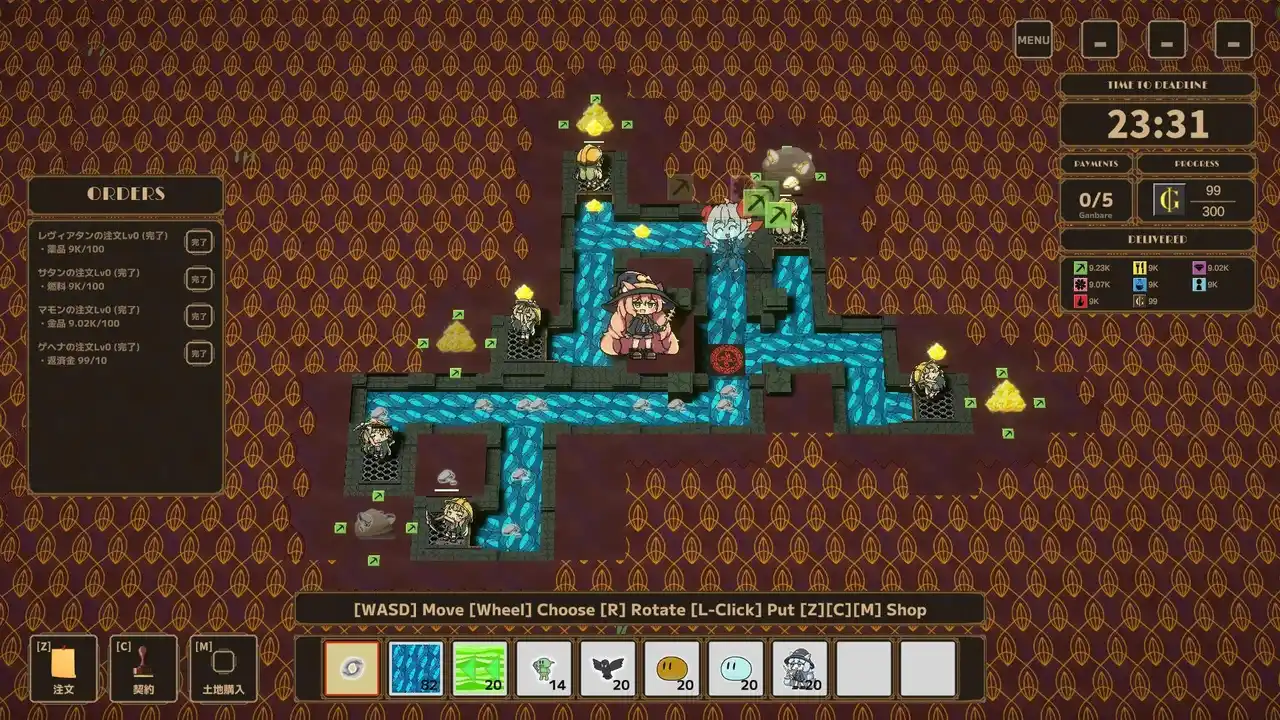 水路のコンベアを繋ぎ、かわいい使い魔たちに命令を下し、製品を作りあげるのです。 |