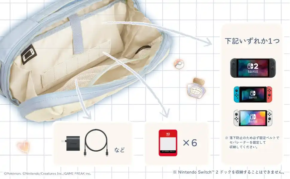 ■収納できるもの ・Nintendo Switch(TM) 2 本体 / Nintendo Switch(TM)本体 / Nintendo Switch(TM)(有機ELモデル) 本体 いずれか1つ ・ACアダプターなど ・ゲームカード6個 ※ Nintendo Switch(TM) 2 ドックを収納することはできません。 ※ 落下防止のため必ず固定ベルトでセパレーターを固定してください。 ■本品と併用可能な製品はこちら https://hori.jp/compatibility/nsx/ |