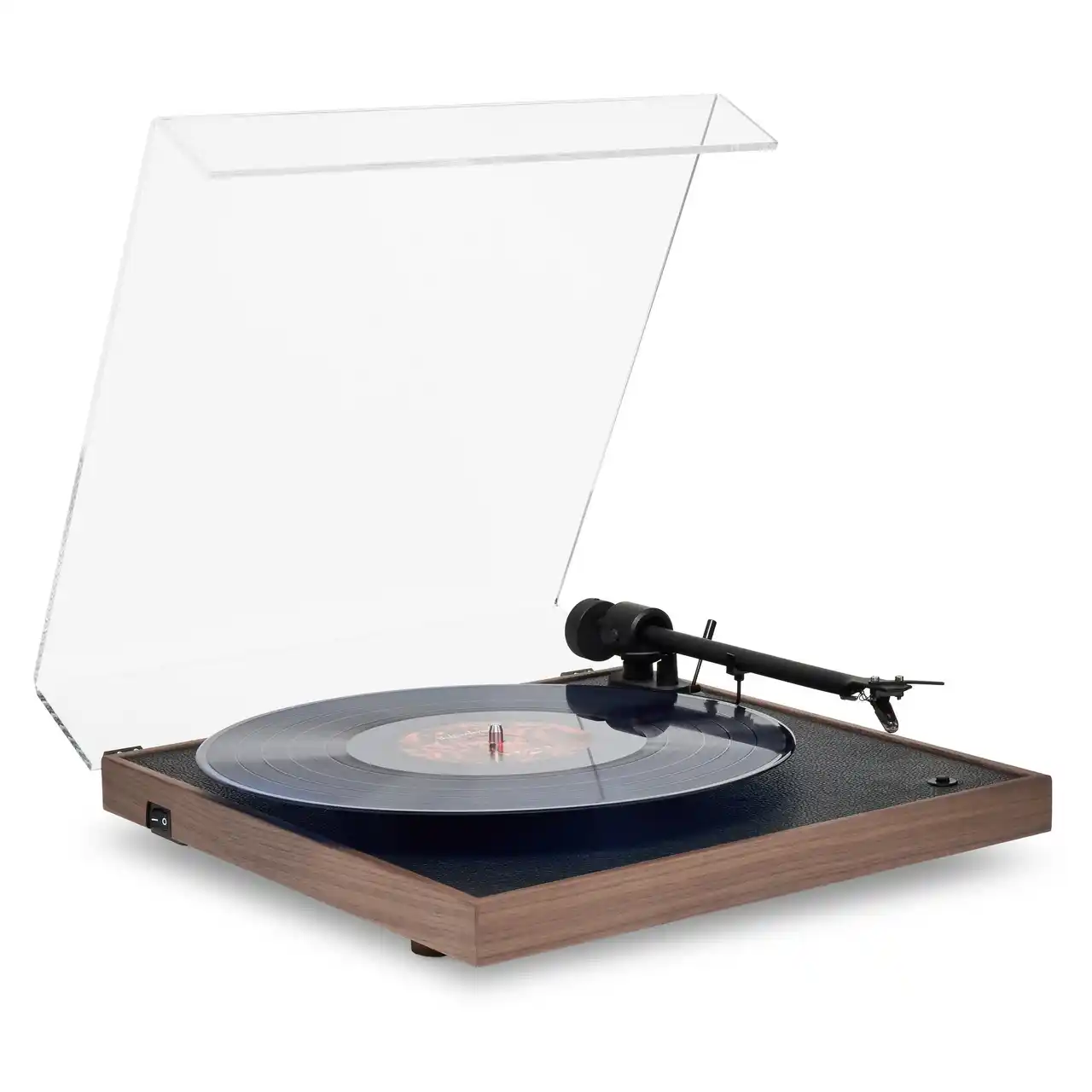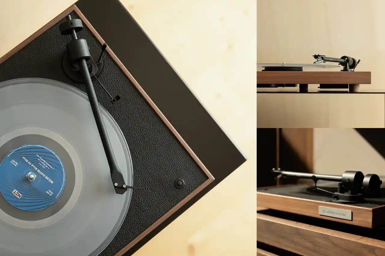 天然ウォールナットまたはオーク材のスクエア筐体に上質なブラックレザーを組み合わせ、レコード盤の中心をわずかにずらした非対称のレイアウトが静かに個性を主張します。 |