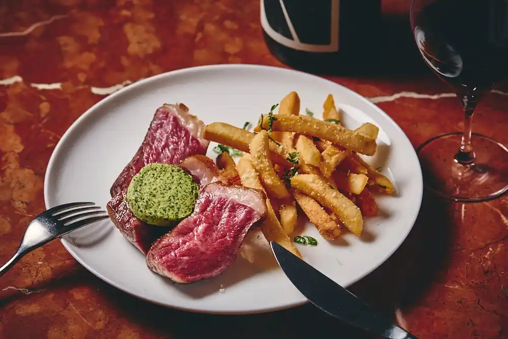 THE UPPERの「炭火焼Tボーンステーキ 1000g」はサーロインとフィレが一緒に楽しめる豪華でボリューム満点なステーキです。炭火焼の高温で焼くことにより、外は香ばしく中はジューシーに仕上がり、しっかりとした肉の旨味を引き出し、スモーキーで香ばしい風味が楽しめます。THE ROOFの「ステークフリット」は炭火オーブンで香ばしくグリルした鹿児島黒牛にたっぷりのフレンチフライを添えました。パセリとにんにくの効いたバターをつけてお召し上がり下さい! |