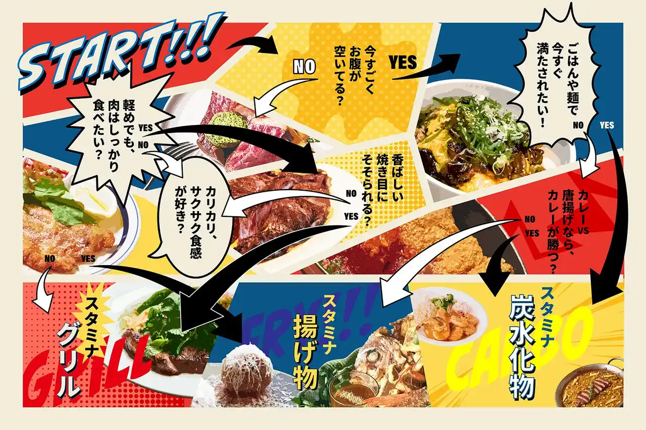 トランジットグループのレストラン&カフェが提供する、夏を乗り切るスタミナ食材を用いた料理から、YES/NOで答えるだけの「スタミナチャート」で、今のあなたに合った一品を見つけてみませんか。 |
