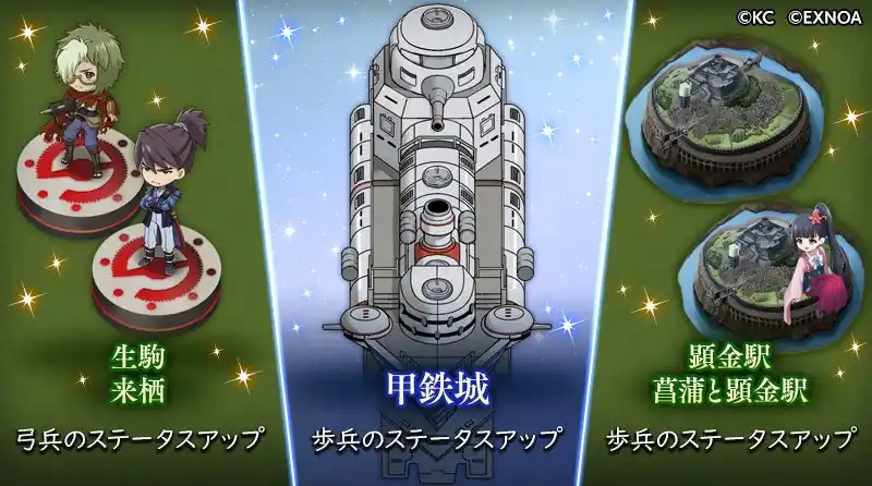 期間中のイベントでは、『甲鉄城のカバネリ』コラボ限定の進軍スキン「甲鉄城」や、コラボ限定オーナメント「生駒」「来栖」、拠点スキン「顕金駅」と「菖蒲と顕金駅」を獲得できます。 |