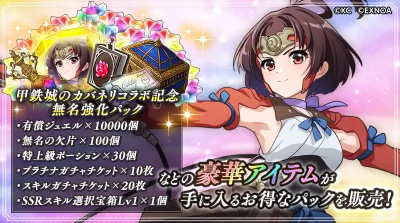 さらに「甲鉄城のカバネリコラボ記念無名確定パック」を購入すると「甲鉄城のカバネリコラボ記念無名強化パック」が購入可能になります!こちらの商品では「無名の欠片」や有償ジュエルに加えて、「プラチナガチャチケット」や「SSRスキル選択宝箱」、「特上級ポーション」など様々な豪華アイテムをお得に獲得することができます! |