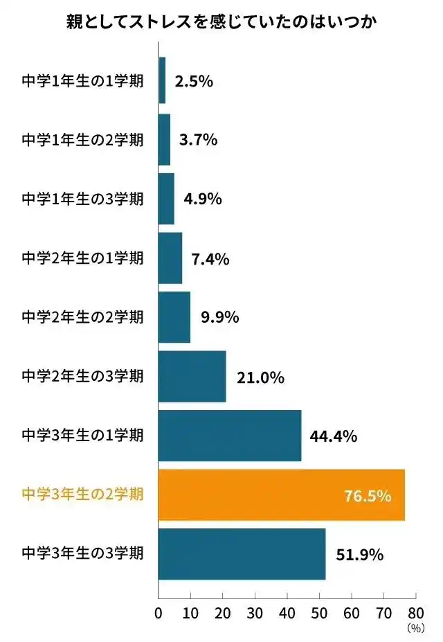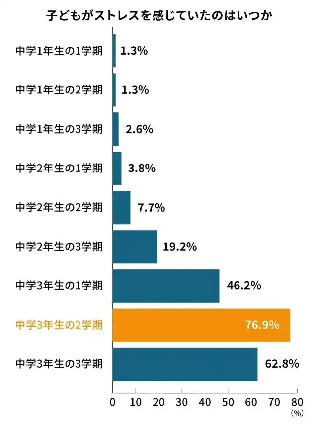 受験期のストレスがピークを迎えるのはいつなのでしょうか?調査結果によると、保護者、子どもともに「中学3年生の2学期」に最もストレスを感じていたことがわかりました。保護者の76.5%、子どもの76.9%がこの時期にストレスを抱えていたと回答しています。 |