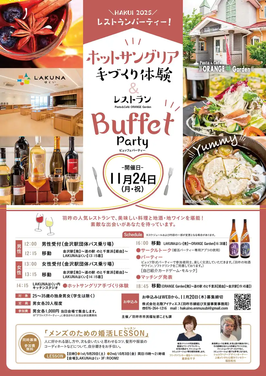 内容: 羽咋の人気レストランを舞台に、ホットサングリア手づくり体験とビュッフェ形式のパーティーを楽しめます。羽咋の地酒やワインと共に、参加者同士の交流を深めます。自己紹介カードゲームも実施予定。 |