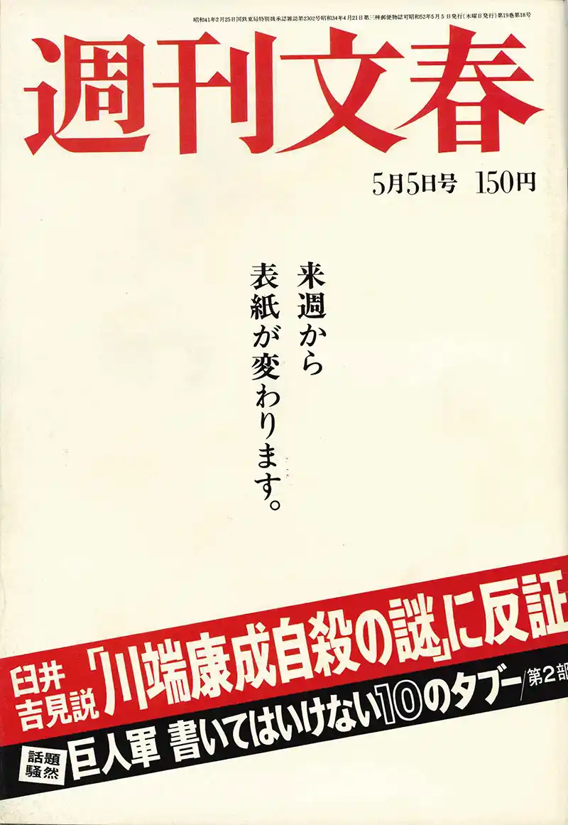 切り替え直前に刊行された同年5月5日号の表紙も白紙で、今回は「週刊文春」史上2度目の「白紙の表紙」となります。 |