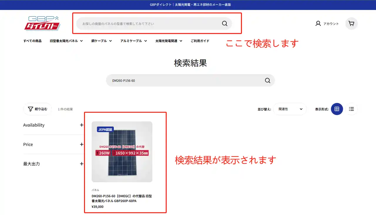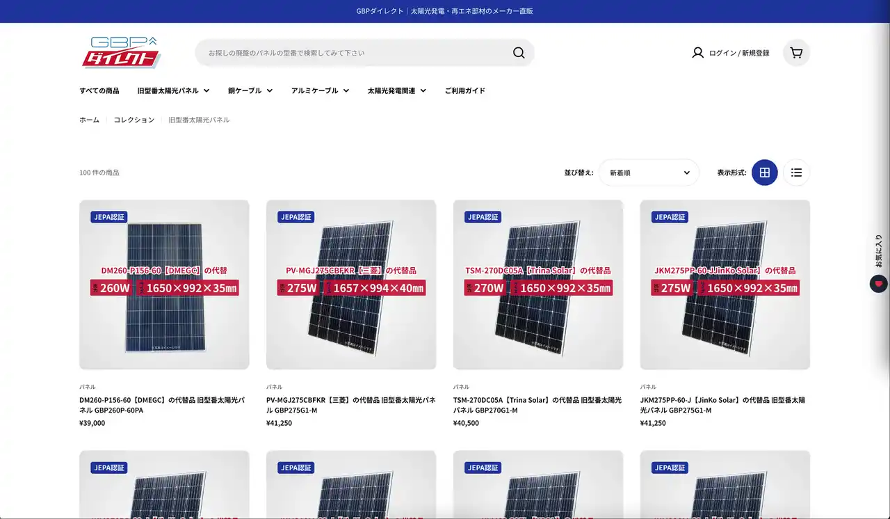 この実績から明らかになったのは、旧型番太陽光パネルの代替品に関して、「調達の利便性」と「小口対応」への強いニーズです。これまでは問い合わせや見積りを経て発注に至るまで多くの工数と時間を要していました。そこでGBPは、新たに自社EC『GBPダイレクト』をリリースしました。旧型番太陽光パネル代替品をGBPダイレクト上で検索・1枚から注文できるようにすることで、調達の負担が大幅に軽減されます。 |