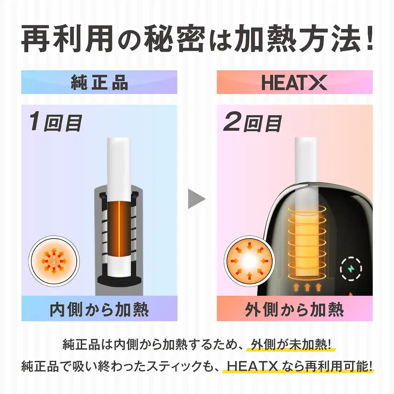 「HEATX」は、1本のたばこスティックで2回吸え、たばこ代を約半分に抑えられる画期的な加熱式たばこデバイスです。他社のデバイス(アイコスイルマなど)で1回目の喫煙後、同じスティックを本デバイスにセットすれば、2回目の喫煙が可能になり、たばこ代が自質半額になります。 |