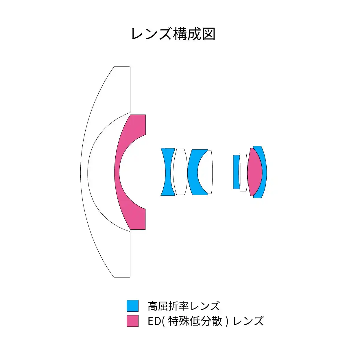 ・レンズ構成:8群10枚(高屈折率レンズ4枚、EDレンズ2枚含む) |