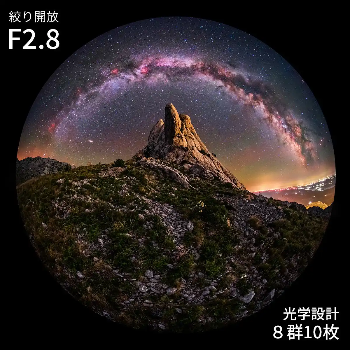 夜景や星景撮影でも鮮明な描写を実現。高屈折率レンズ4枚、EDレンズ2枚を含む8群10枚の光学設計は、中心から周辺までクリアで高コントラスト。 |