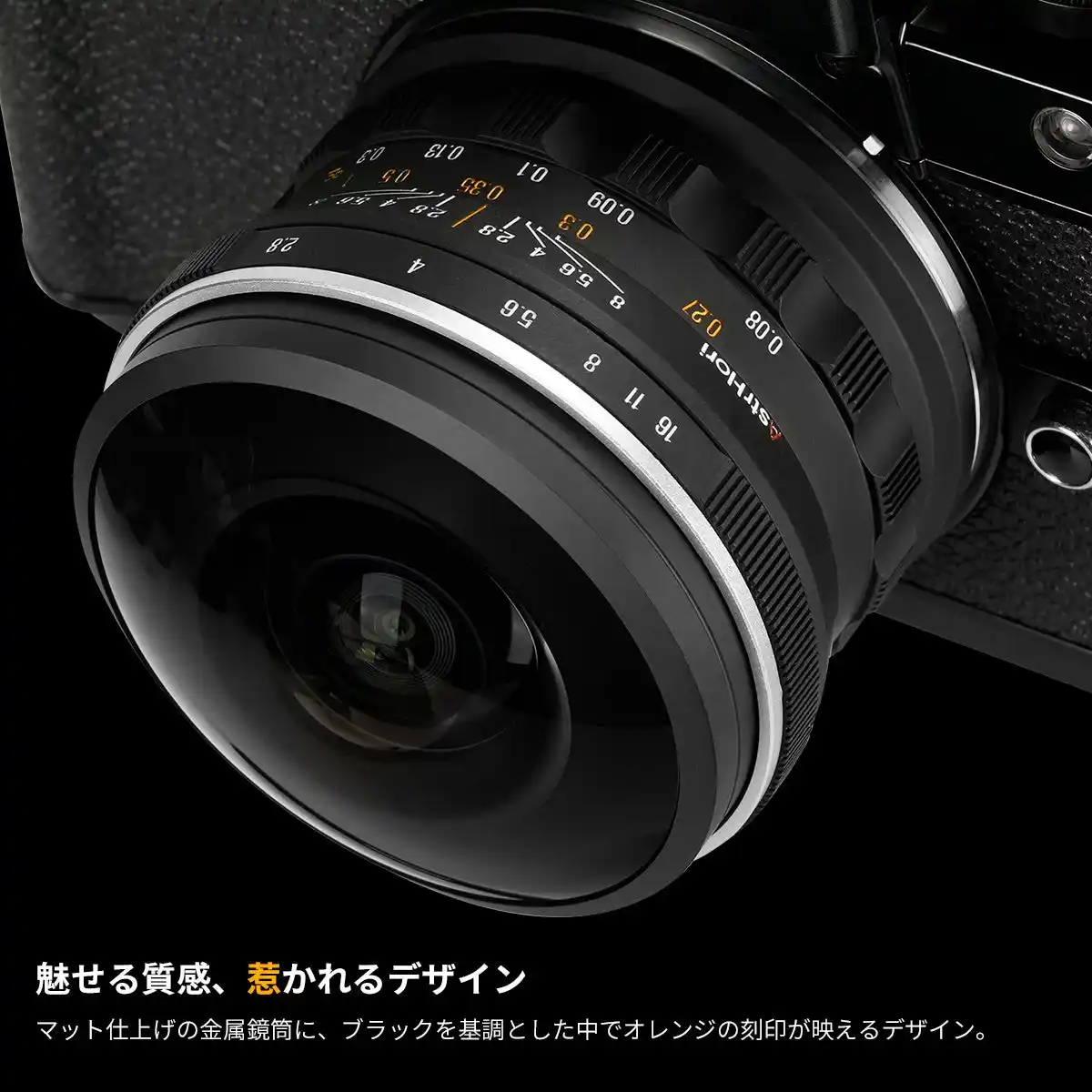 製品概要 「AstrHori 6mm F2.8 CIRCULAR FISHEYE」は、フルサイズセンサー対応の円周魚眼レンズです。220°の圧倒的な視野角で世界を球体のように描写できます。F2.8の明るさと8群10枚の光学設計により、周辺までクリアで高コントラストな描写を実現し、夜景や星景でも鮮明な表現が可能です。フォーカスリングや絞りリングの直感的操作感と、マット仕上げ金属鏡筒でブラック×オレンジのデザインにより、撮影の快適さと所有欲を両立。約340gの軽量コンパクトボディは持ち運びやすく、アウトドアや旅行にも最適です。最短撮影距離0.08mで被写体に近づいた独創的な構図も可能で、風景を水滴やガラス玉のように収めたような箱庭的表現など、様々な撮影を楽しめる1本です。360°パノラマやVR素材も少ない枚数で撮影可能です。 |