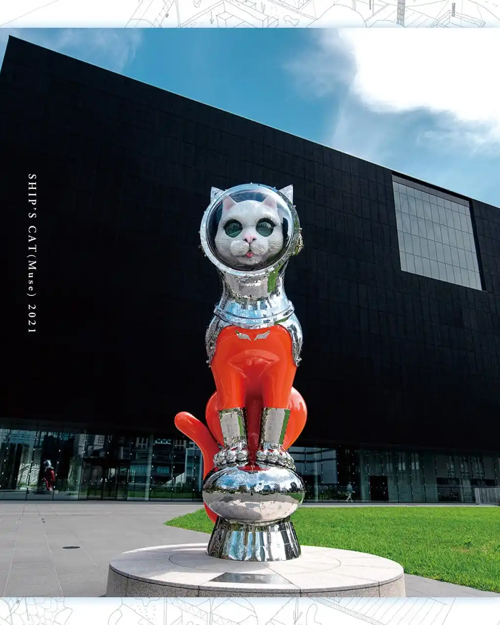 【代表作】 「SHIP’S CAT(Muse)」 《SHIP’S CAT(Muse)》は、2022 年に開館した黒い直方体の外観が特徴的な大阪中之島美術館と、内部に組み込まれた立体的な「パサージュ」を行き交う人々を見守るために制作された《SHIP’S CAT》シリーズの彫刻作品である。堂島川に面する美術館が世界に発信するための象徴となり、守り神になるよう願いが込められた。 |