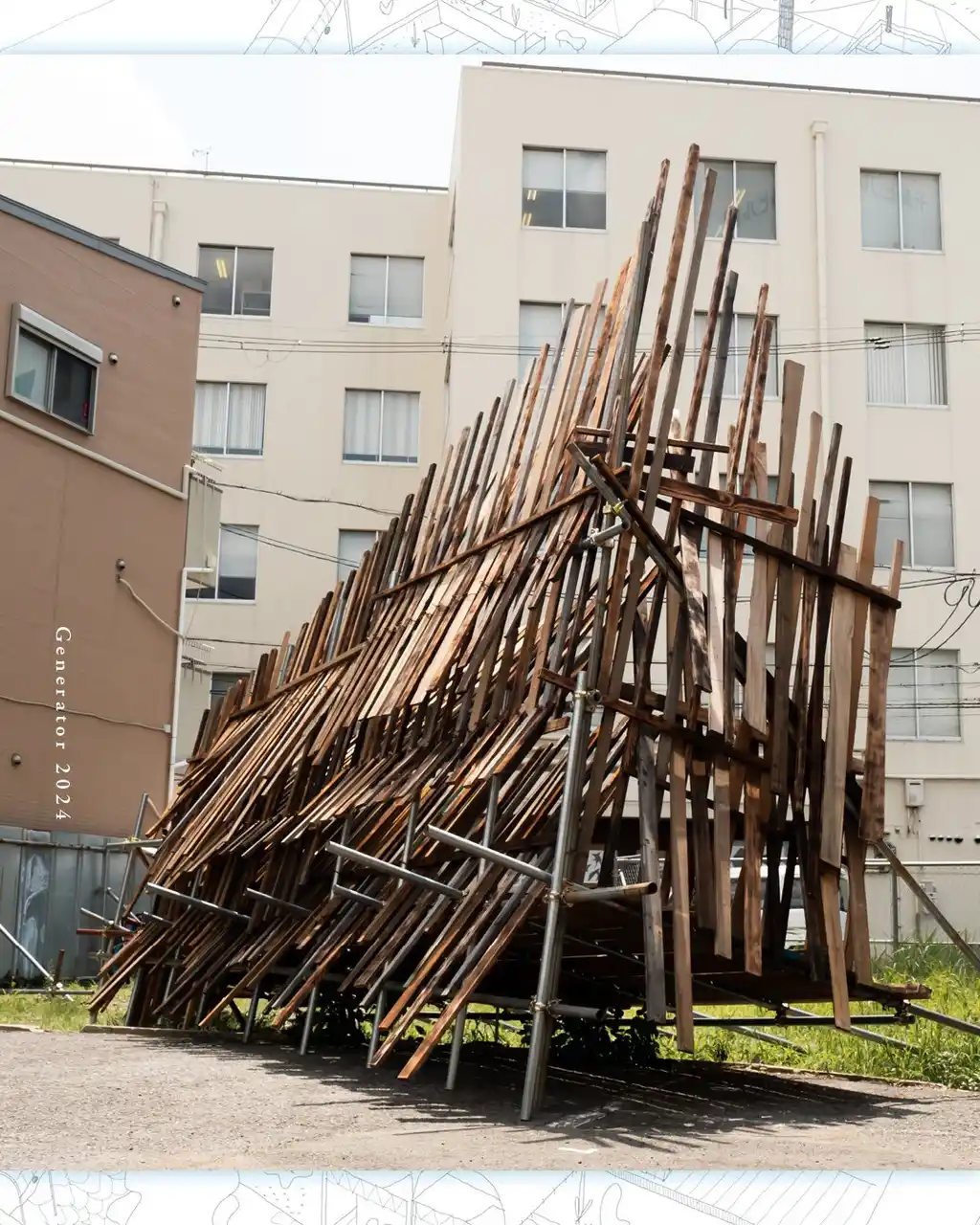 【代表作】 「Generator」2024 北加賀屋の空き地にその地域で収集したさまざまな人の営みを持つ廃材を使い体験型作品をその場で一から制作設置、その場所やモノの記憶、空間を共有し、時を紡ぎながら新たな人の交流を創出することを目指した。 ここに訪れた作品鑑賞・体験する人々の様子を道ゆく人が目撃し、好奇心を刺激され、興味を持ちこの場に吸い寄せられていくような、良い意味で人の動きを誘発する装置となり、ここで新しい何かが生まれることを試みた。 |